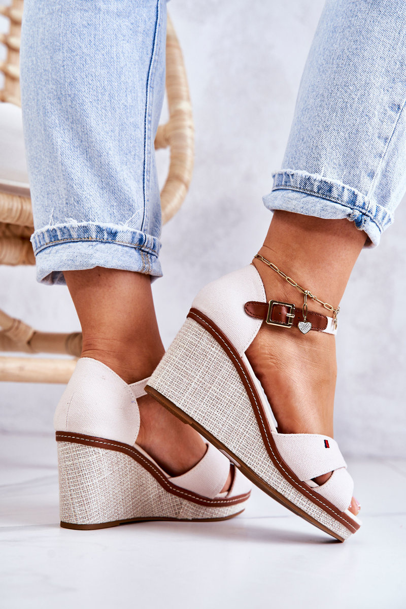 Jedinečné sandály na klínku s copánkem. Boty jsou vyrobeny z textilního materiálu. Vyztužená pata. O vaše pohodlí při používání se postará měkká stélka z kombinace eko kůže a textilního materiálu. Zapínání kolem kotníku pomocí nastavitelného pásku s přezkou. Dekorace nití na jednom z pruhů. Boty mají otevřenou špičku a krytý podpatek. Díky tomuto podpatku jsou boty stabilnější než tradiční vysoké podpatky. Skvělý model pro letní dny! Při výběru velikosti použijte tabulku velikostí.