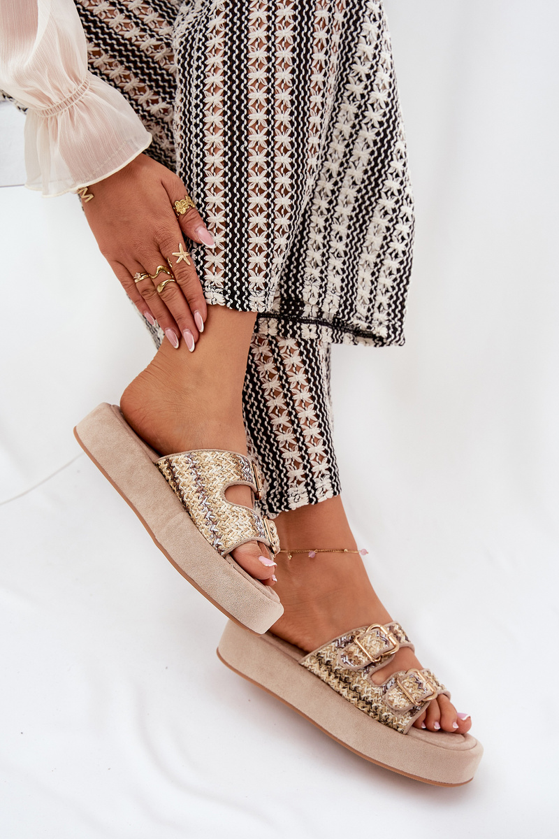 Stylové dámské pantofle na platformě, které spojují pohodlí s módním vzhledem. Ozdobené pletením a sponami, což dodává jedinečný charakter. Měkká, eko semišová vložka zajišťuje pohodlí po celý den. Tyto pantofle se skvěle hodí do letních stylizací, pasují k šatům, sukním nebo šortkám a vnáší lehkost do každé příležitosti. Při výběru velikosti se řiďte tabulkou velikostí.