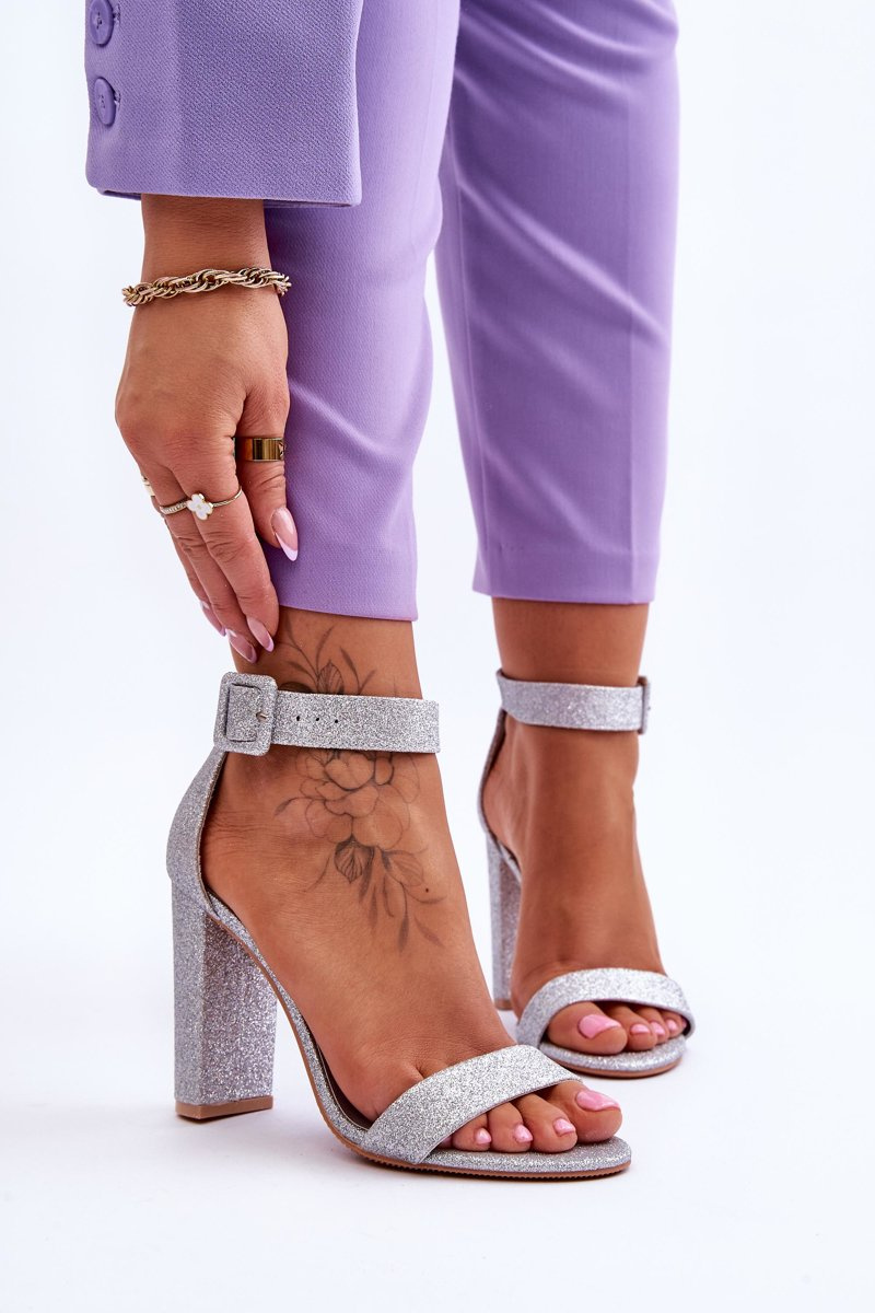 Dámské Sandály Na Podpatku Stříbrné Brokát Joalice