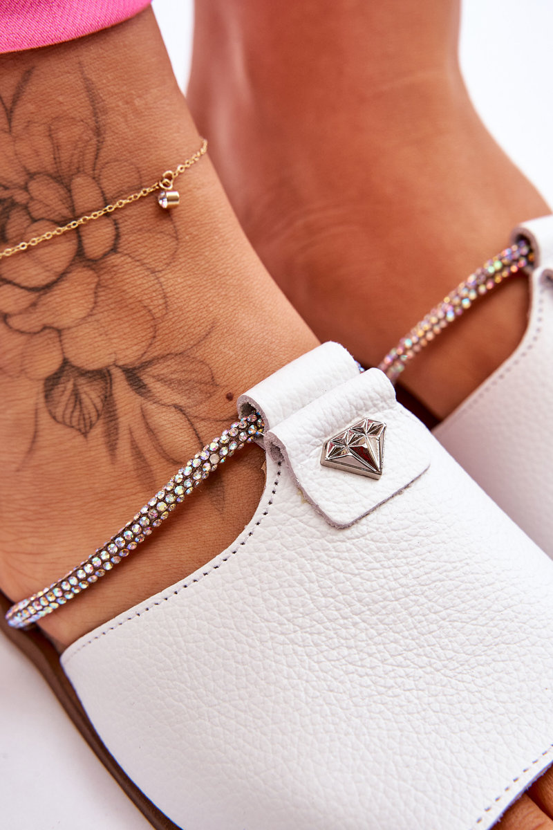 Klasické dámské pantofle jsou vyrobeny z přírodní kůže. Mají proužek s tryskami imitující zirkony. Žabky jsou nasazeny na plochém podpatku s podrážkou z plastu. Měkká stélka je také vyrobena z přírodní kůže. Tento model je ideální pro horké dny! Při výběru velikosti se řiďte tabulkou velikostí.