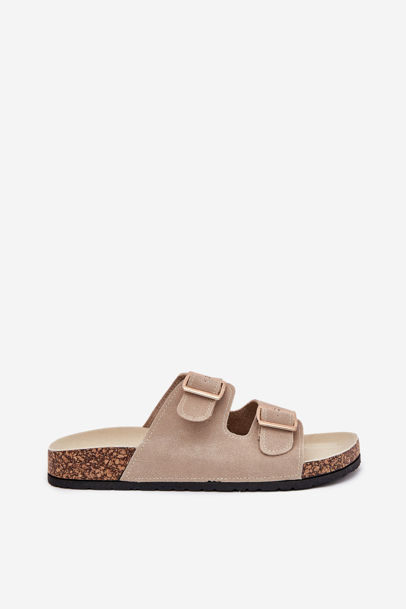 Dámské pantofle z eko semiše, umístěné na korkové platformě, jsou kombinací stylu a pohodlí. Dvě zlaté spony s nastavitelnými pásky umožňují dokonalé přizpůsobení k noze, a profilovaná stélka zajišťuje komfort po celý den. Ideální pro letní stylizace, skvěle se hodí k šatům, sukním nebo šortkám. Při výběru velikosti se řiďte tabulkou velikostí.