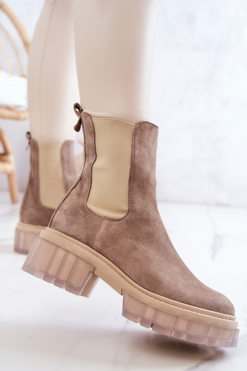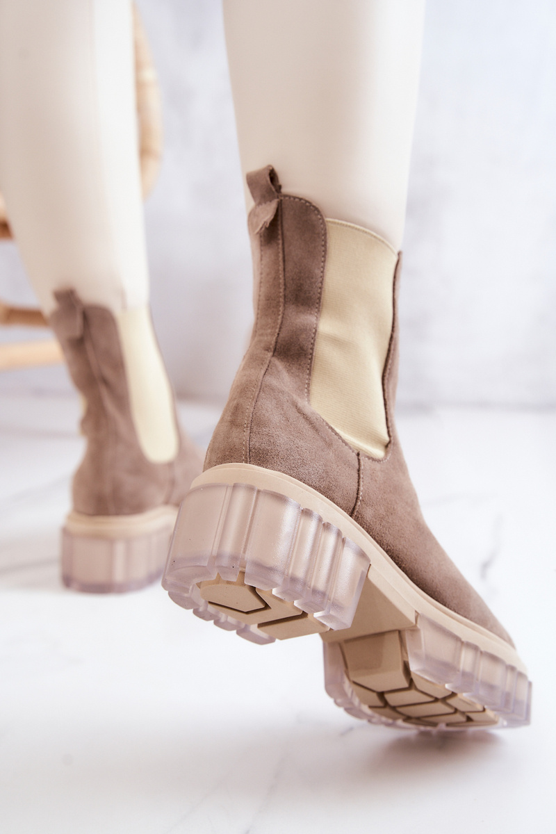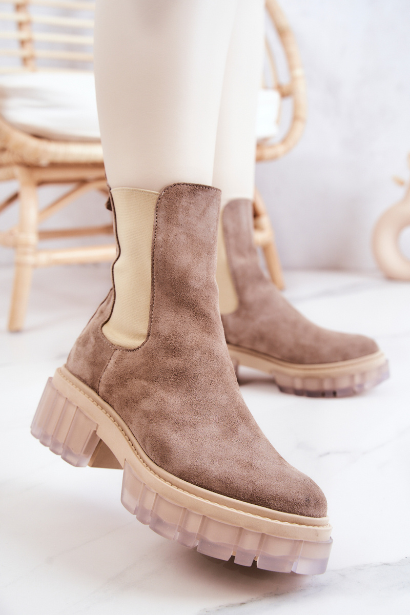 Kozačky na masivní platformě se širokým podpatkem ve stylu Chelsea boots. Mají vysoký svršek, sahající až nad kotník. Vyrobeno z přírodní semišové kůže. Mají dodatečnou pružnou vsadku, díky které se svršek dokonale přizpůsobí šířce nohavic. Boky podrážky zdobí průhledný, gumový materiál. Při výběru velikosti použijte tabulku velikostí