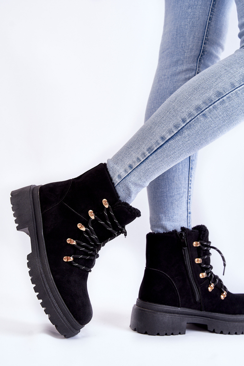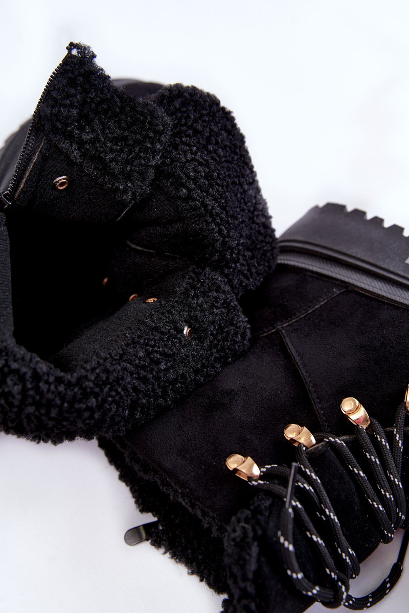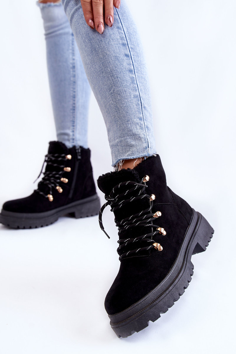 Módní dámské kozačky budou perfektní pro podzimní, chladné dny! Zapínání na zip na boku svršku a šněrování vpředu. Trappery jsou uvnitř zateplené v podobě přikrývky na obuv a na konci svršku ovčí kožich. Jsou namontovány na plochém podpatku a platformě s drážkami. Podpatek je mírně vyztužený. Při výběru velikosti použijte tabulku velikostí.