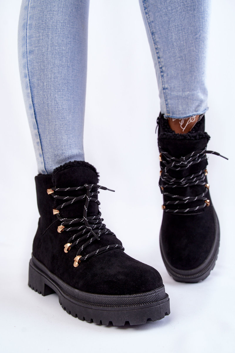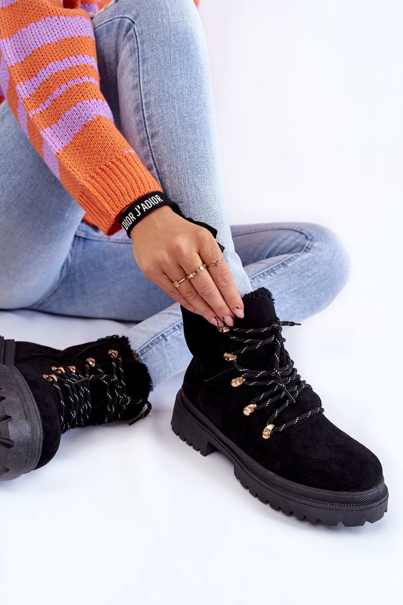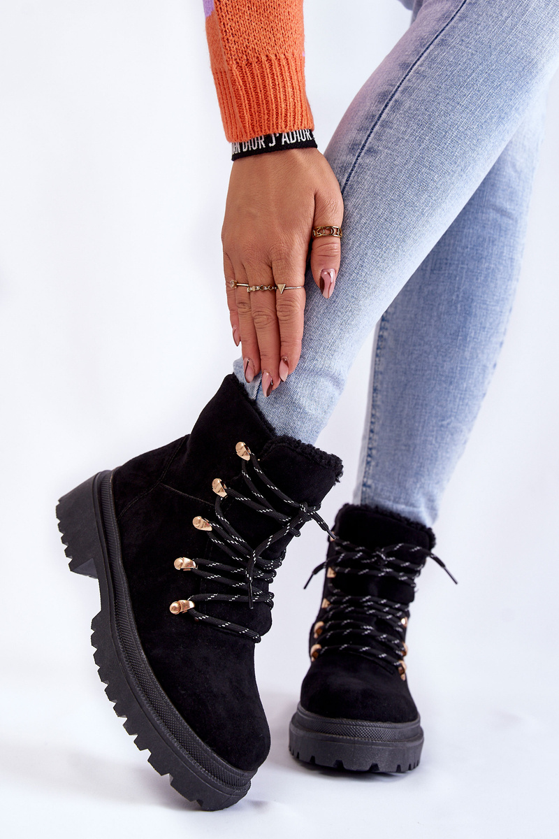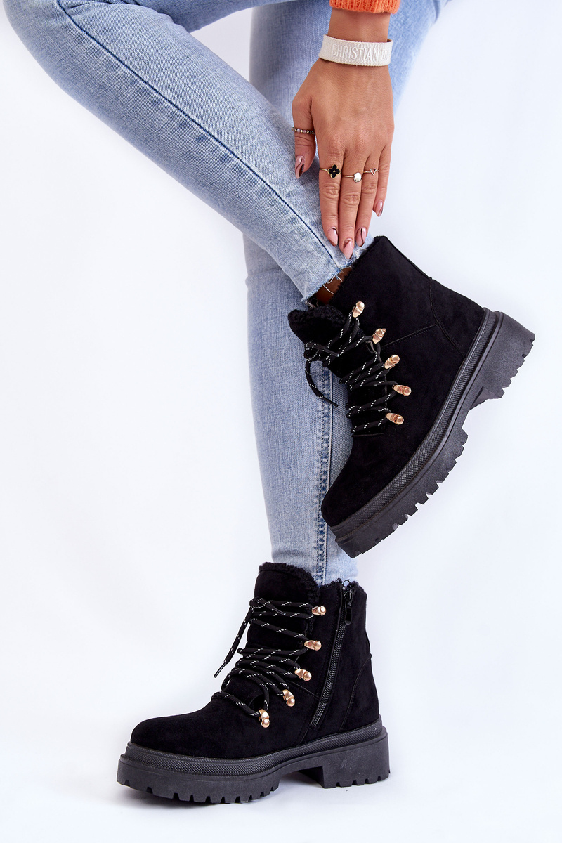 Módní dámské kozačky budou perfektní pro podzimní, chladné dny! Zapínání na zip na boku svršku a šněrování vpředu. Trappery jsou uvnitř zateplené v podobě přikrývky na obuv a na konci svršku ovčí kožich. Jsou namontovány na plochém podpatku a platformě s drážkami. Podpatek je mírně vyztužený. Při výběru velikosti použijte tabulku velikostí.