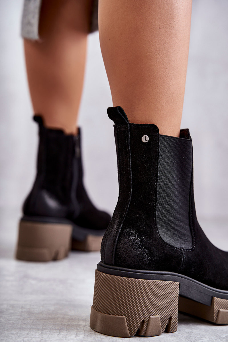 Kozačky na masivní platformě se širokým podpatkem ve stylu Chelsea boots. Mají vysoký svršek, sahající až nad kotník. Vyrobeno z přírodní kůže. Mají dodatečnou pružnou vsadku, díky které se svršek dokonale přizpůsobí šířce nohavic. Boty jsou zateplené dekou na boty. Kozačky jsou ideální pro podzimní stylizace. Při výběru velikosti použijte tabulku velikostí