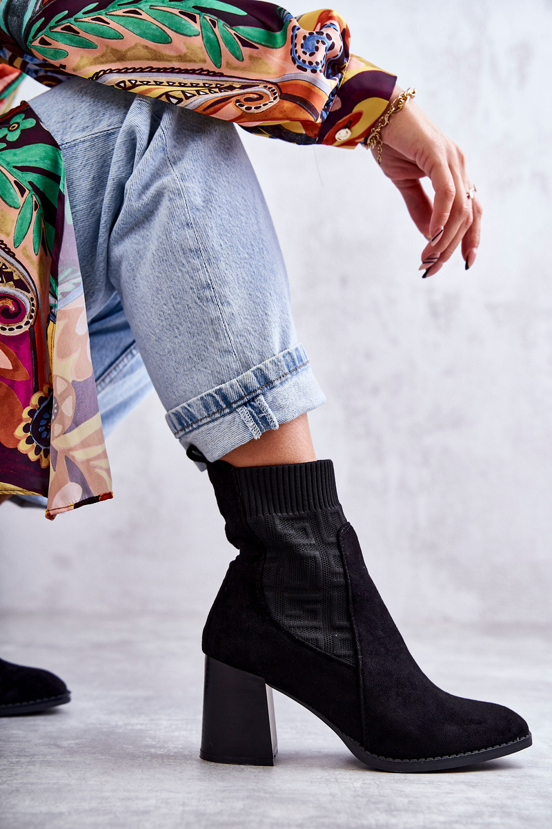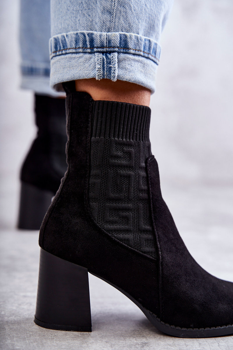 Skvělé dámské kozačky módního střihu. Vyrobeno z kombinace eko semiše a elastické tkaniny. Tento model je nasazen na patě v podobě masivního sloupku. Špička je hranatá. Boty mají pevný podpatek. Uvnitř jsou částečně zateplené dekou na boty. Využijete je v mnoha situacích: v práci, na setkání s přáteli nebo na rande. Při výběru velikosti použijte tabulku velikostí.