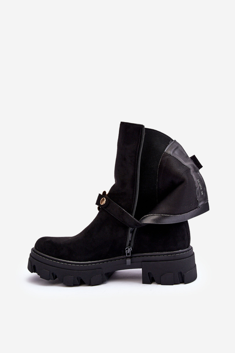 Jedinečné, dámské kozačky s vyšším svrškem z eko semiše. Na straně jsou zdobeny pruhy se sponami. Zapínání na zip. Jsou osazeny na masivním plochém podpatku a platformě s drážkami po stranách. Tyto boty mají vnitřní zateplení v podobě měkkého, na dotek příjemného kožíšku. Skvělý model pro mnoho stylů! Při výběru velikosti použijte tabulku velikostí.