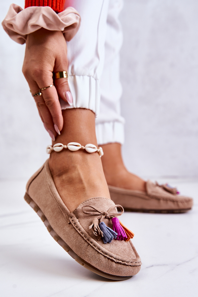 Skvělé dámské mokasíny pro teplé a jasné dny! Vyrobeno z ekologického semiše příjemného na dotek. Mají vyztuženou patu. Vpředu jsou ozdobné, eko semišové třásně s mašlí. Zakrytý, kulatý nos. Boty mají měkkou, perforovanou stélku z kůže. Mokasíny mají pružnou podrážku vyrobenou z pryžového materiálu. Ideální do práce nebo na víkendový výlet s přáteli. Model univerzálního střihu, se kterým můžete poskládat mnoho stylů! Při výběru velikosti použijte tabulku velikostí.