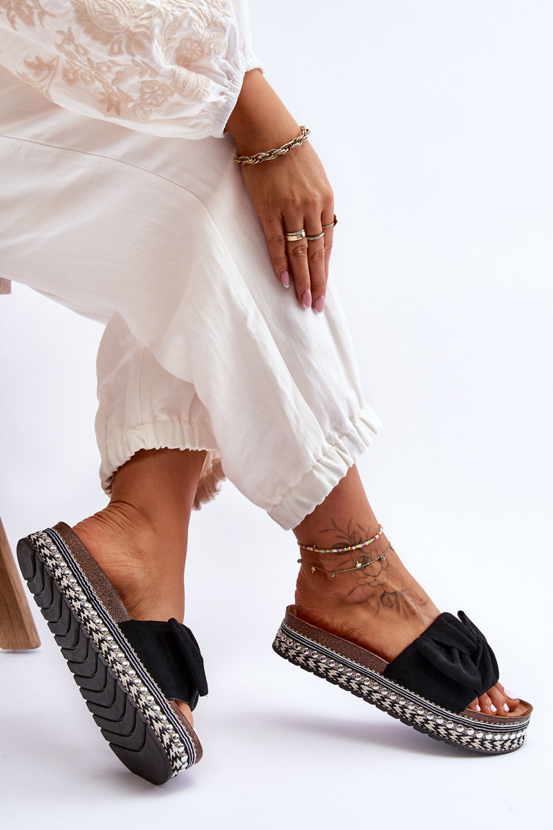Klasické dámské žabky jsou usazeny na masivní platformě s ozdobami v podobě šňůrek a cvočků. Vyrobeno z ekologického semiše. Na přední straně je ozdoba v podobě mašle. Profilovaná stélka je vyrobena z na dotek příjemného ekologického semiše. Tyto žabky jsou perfektní model na léto! Při výběru velikosti se prosím řiďte tabulkou velikostí.