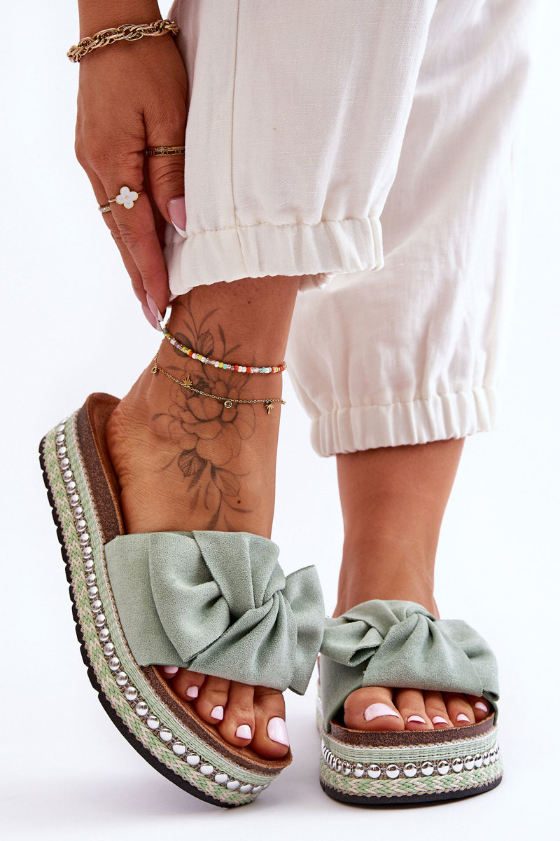 Klasické dámské žabky jsou usazeny na masivní platformě s ozdobami v podobě šňůrek a cvočků. Vyrobeno z ekologického semiše. Na přední straně je ozdoba v podobě mašle. Profilovaná stélka je vyrobena z na dotek příjemného ekologického semiše. Tyto žabky jsou perfektní model na léto! Při výběru velikosti se prosím řiďte tabulkou velikostí.
