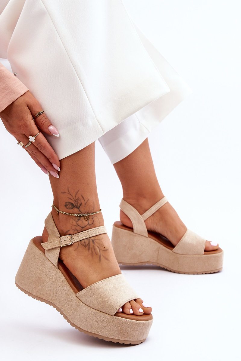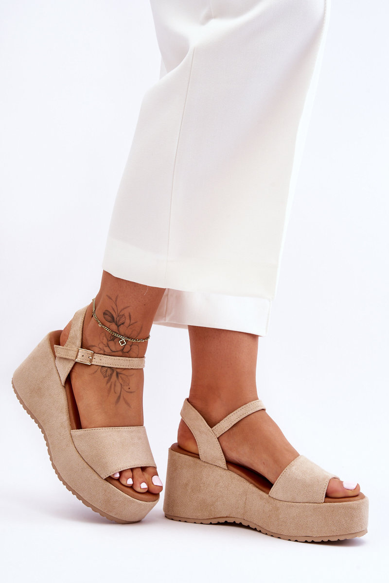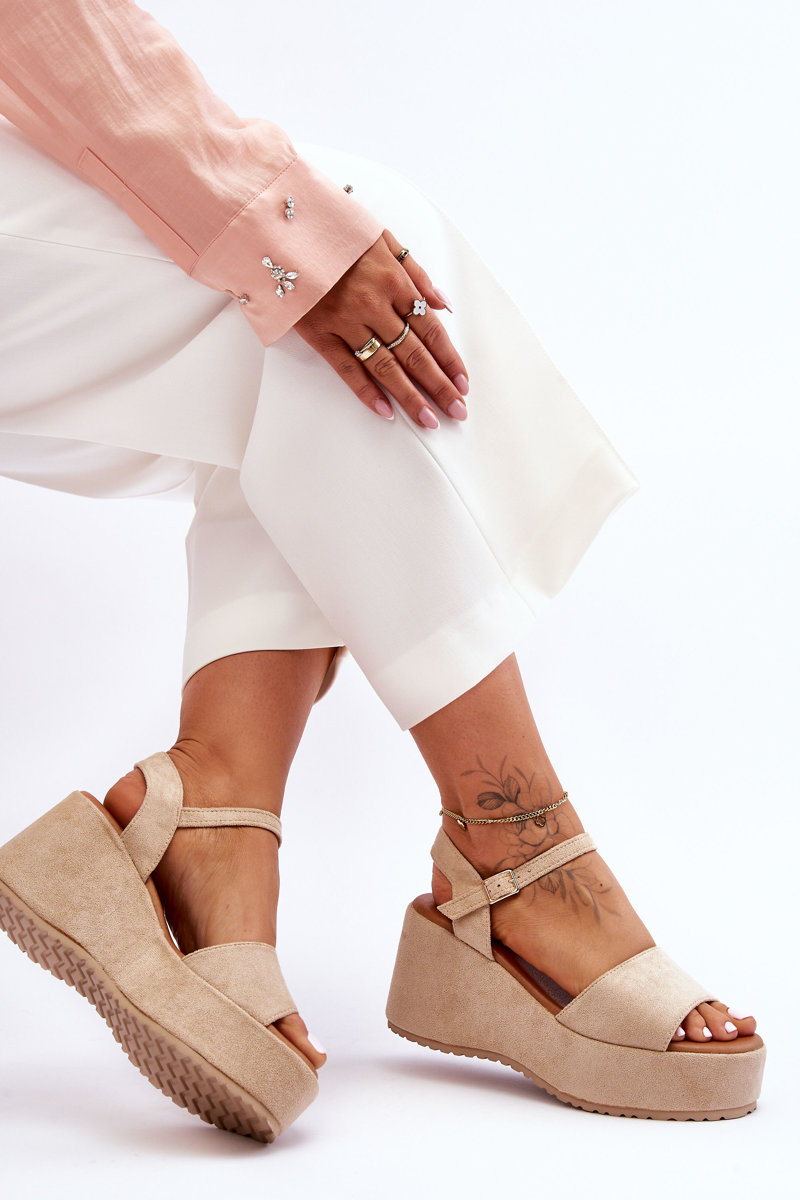 Skvělé dámské sandály vyrobené z ekologického semiše. Kolem kotníku se zapínají nastavitelným páskem s přezkou. Stélka je vyrobena z měkké eko kůže. Sandály mají otevřenou špičku a patu. Nasazené na masivní platformě a klínovém podpatku. Tyto sandály jsou perfektním modelem pro horké dny! Při výběru velikosti se řiďte tabulkou velikostí.