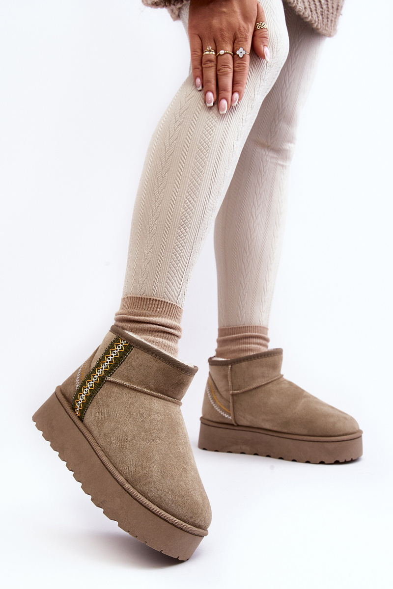 Dámské sněžky s módním vzorem na čepici. Zateplené silným syntetickým kožešinou uvnitř. Vyrobené z eko semiše. Osazené na masivní platformě z gumového materiálu. Čepice za kotník. Ideální pro jarní-zimní stylizace! Při výběru velikosti se řiďte tabulkou velikostí.