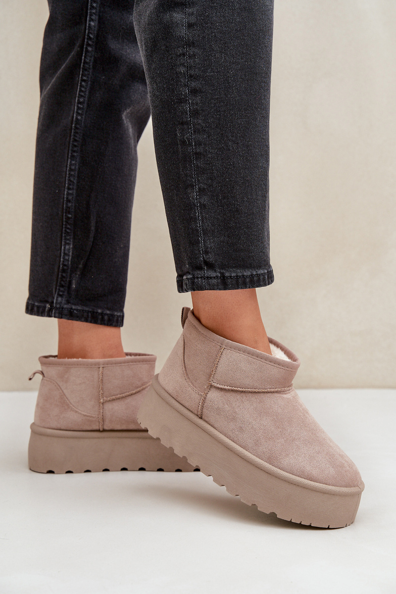 Dámské sněhule vyrobené z ekosuede. Umístěné na masivní platformě z pryže. Kotníková špička. Vnitřek vyplněný kožešinou. Tento módní model bude ideální pro téměř každý podzimní a zimní outfit! Určitě byste je měla mít! Při výběru velikosti se řiďte tabulkou velikostí.
