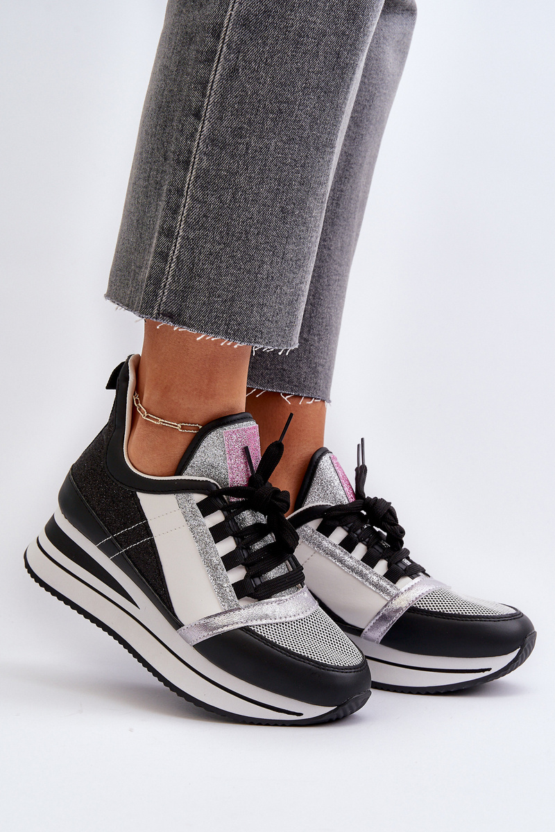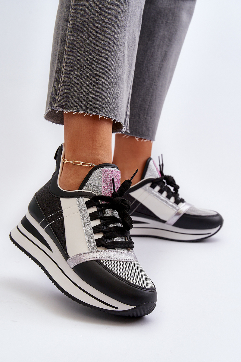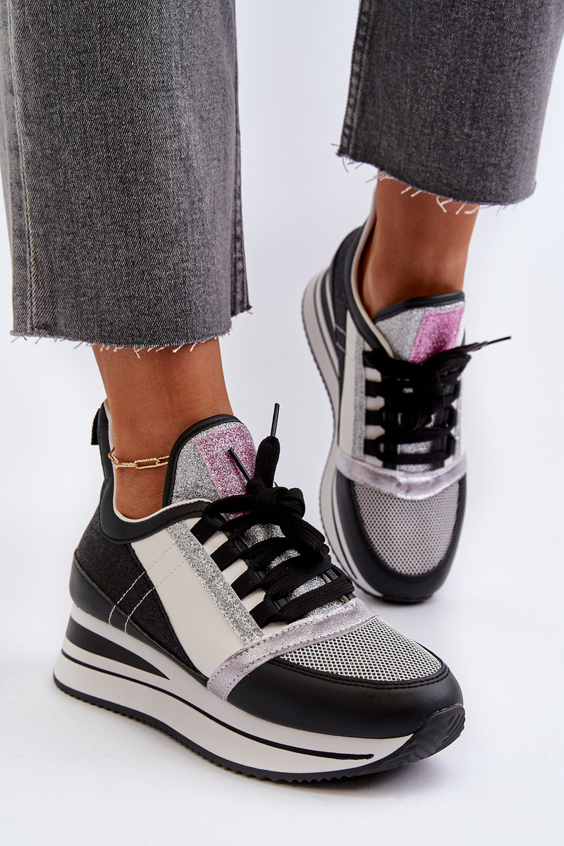 Dámské tenisky jsou kombinací stylu, pohodlí a jedinečného vzhledu. Umístěné na platformě a klínku. Svršek zdobený flitry jim dodává jedinečný lesk a efektnost. Vložka vyrobena z pěnovitého materiálu je navíc vyjímatelná, což usnadňuje údržbu bot. S tímto modelem vytvoříte mnoho skvělých stylizací! Při výběru velikosti se řiďte tabulkou velikostí.