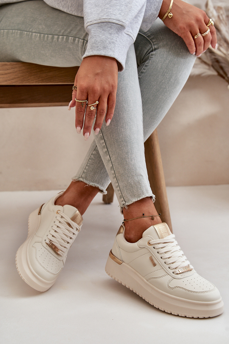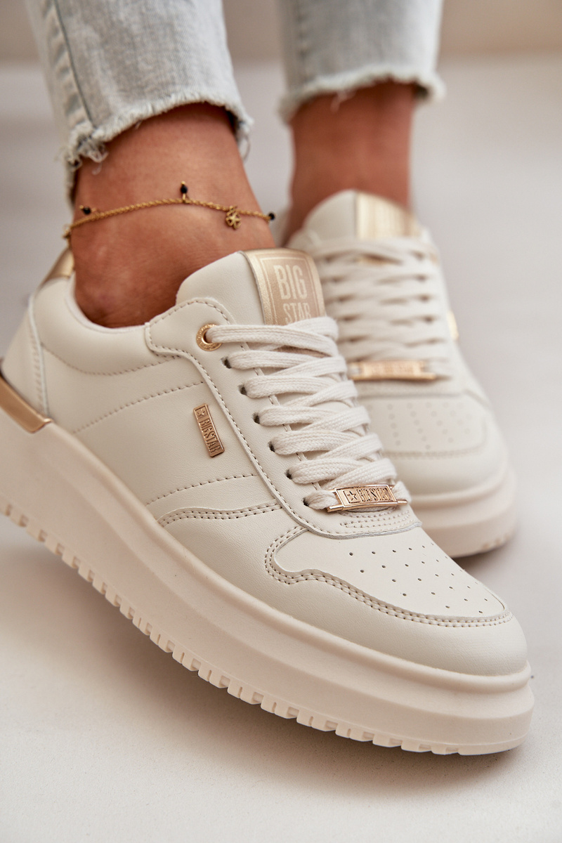 Dámské sneakersy značky Big Star. Vyrobené z eko kůže. Uloženy na platformě. Tento model se vyznačuje zlatými prvky. Vložka HI POLLY SYSTEM je vyrobena z recyklovaných materiálů, je odolná proti oděru a deformacím a absorbuje vlhkost. Přizpůsobte je svým oblíbeným stylizacím a užijte si módní vzhled a pohodlí po celou sezónu! Při výběru velikosti se řiďte tabulkou velikostí.