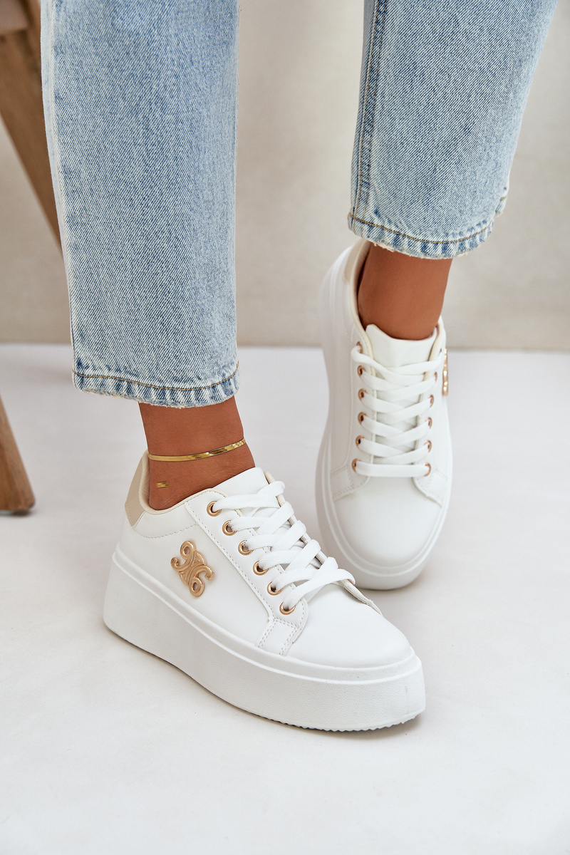 Stylové sneakersy vyrobené z ekologické kůže jsou skvělou volbou pro ty, kteří si cení módního vzhledu a pohodlí. Usazené na masivní platformě, poskytují moderní vzhled a komfort nošení. Na boku jemná zlatá ozdoba dodává eleganci a charakter. Měkká pěnová vložka se stará o pohodlí během každodenních aktivit. Tyto sneakersy skvěle padnou jak k ležérním, tak k sportovním stylizacím! Při výběru velikosti se řiďte tabulkou velikostí.
