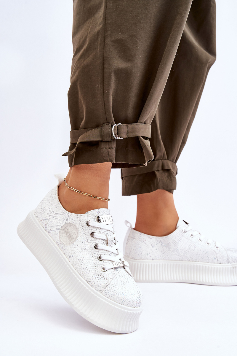 Skvělé dámské tenisky vyrobené z vysoce kvalitní eko kůže. Tento módní střih bude dokonale ladit s každodenními stylizacemi. Klasický šněrovací model má na boku gumový emblém s logem značky GOE. Díky měkké stélce z ekokůže se v nich budete cítit pohodlně po celý den. Masivní platforma má na bocích drážky. Při výběru velikosti se řiďte tabulkou velikostí.