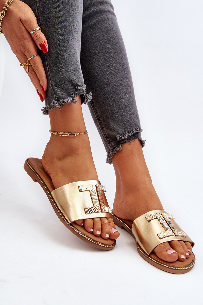Dámské sandály na ploché podrážce, která zaručuje stabilitu a pohodlí během nošení. Zlatá ozdoba vpředu dodává eleganci a jemnost. Tento model skvěle doplní letní stylizace! Při výběru velikosti se řiďte tabulkou velikostí.