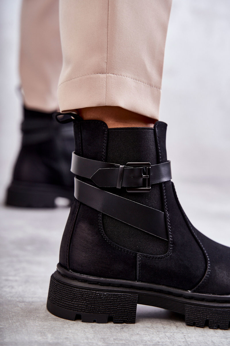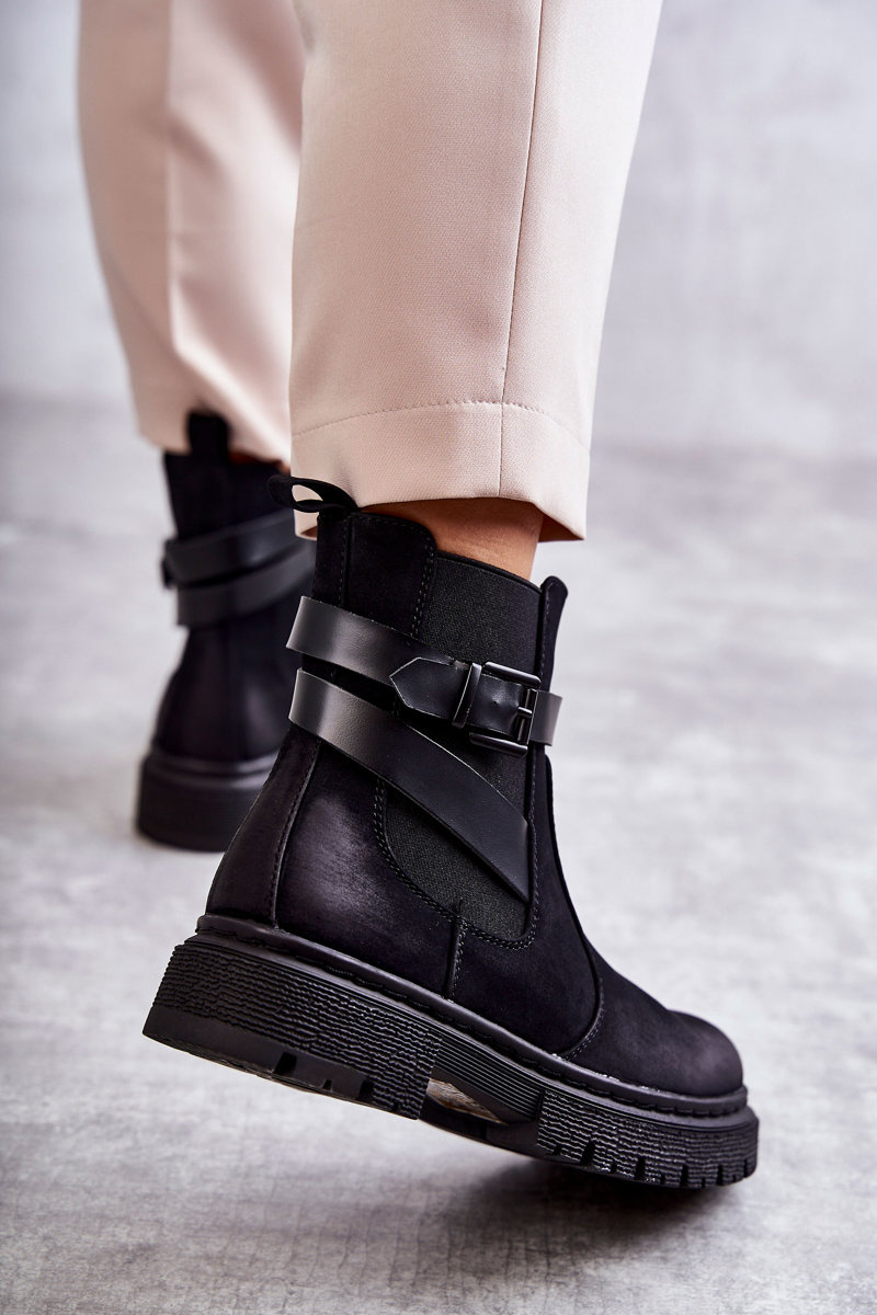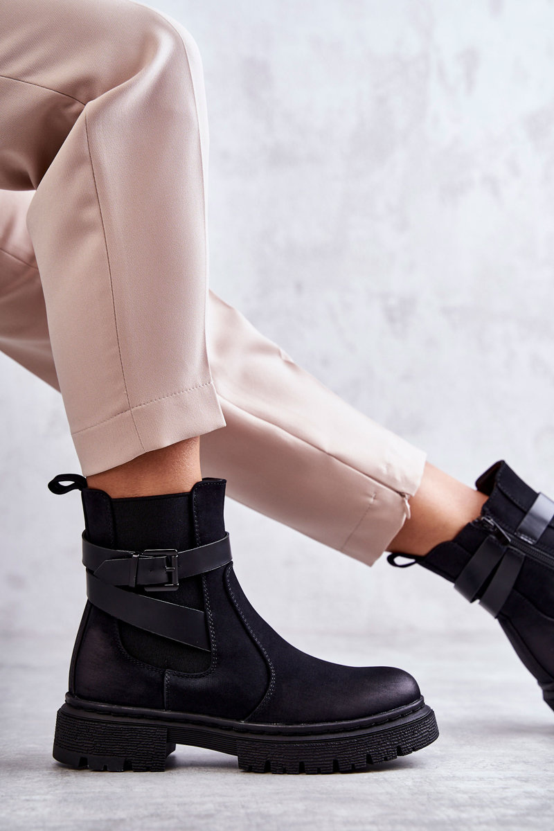 Jedinečné dámské kozačky jsou vyrobeny z ekologického semiše. Tyto Chelsea boty mají na boku svršku ozdobný pásek z ekokůže, zapínaný na přezku. Navíc se boty zapínají na zip. Nasazené na plochém podpatku a platformě. Vnitřek byl zateplen dekou na boty. Skvělý model pro mnoho stylů! Můžete je nosit jak ke kalhotám, tak k sukni. Při výběru velikosti použijte tabulku velikostí.