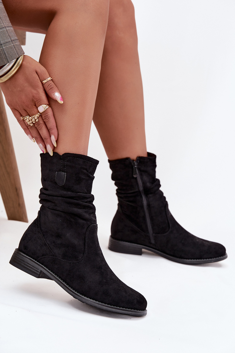 Dámské kotníkové boty vyrobené z eko semiše. Plochý podpatek zajišťuje pohodlí po celý den a řasený vršek jim dodává jemný, módní charakter. Zip usnadňuje obouvání a vyhřívání uvnitř zaručuje teplo a pohodlí. Ideální pro každodenní stylizace. Při výběru velikosti se řiďte tabulkou velikostí. Při výběru velikosti se řiďte tabulkou velikostí.