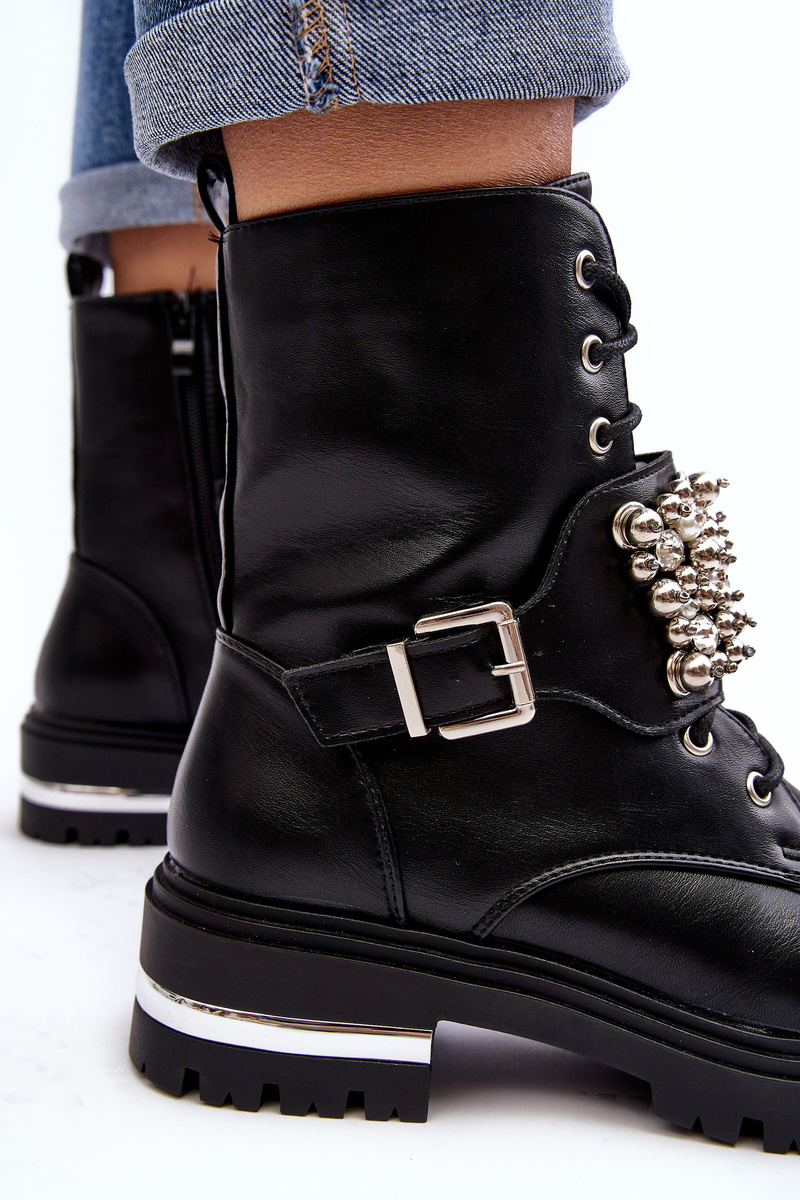 Dámské botky s vyšším kotníkem. Vyrobeny z ekokože. Zapínání na zip na vnitřní straně kotníku a také mají tkaničky. Vnitřek je vyplněný kožešinou. Na podpatku je lesklý prvek. Přední široký pásek s ozdobou a sponou. Tento model je ideální na podzimní dny! Určitě byste je měla mít ve své skříni! Při výběru velikosti se řiďte tabulkou velikostí.