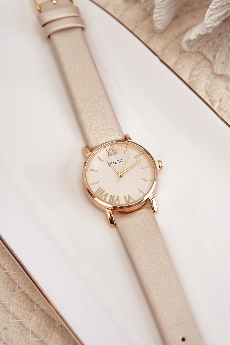 Dámské hodinky značky Ernest. Řemínek vyrobený z ekologické kůže. Jednoduchý, ale výjimečný tvar těchto hodinek je činí ideálním doplňkem jak pro každodenní, tak i formálnější příležitosti. Díky své univerzálnosti a eleganci vždy bude jemným doplňkem každého oblečení.