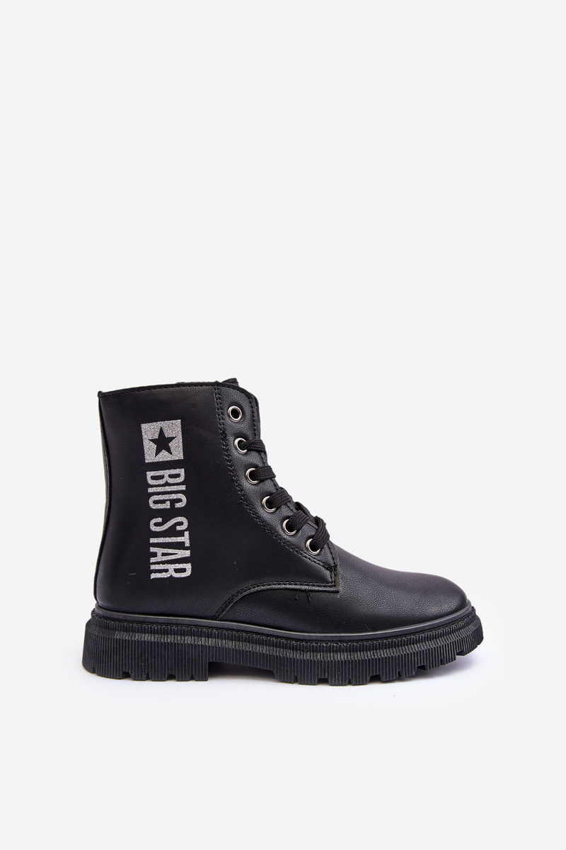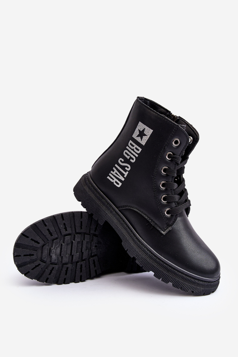 Krásné dětské botky od značky BIG STAR. Vyrobeno z eko kůže. Střed oceněný obuvníkem. Zapíná se zipem po straně a také mají šněrování. Špička je jemně zesílena. Na kraji logo značky Big Star. Při výběru velikosti se řiďte tabulkou velikostí.