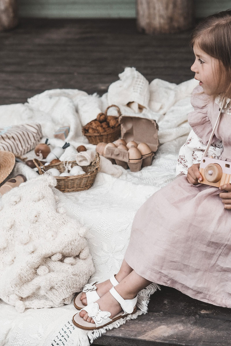 Sandály z eko kůže s ozdobnými motýlky na pásku. Motýlci mají navíc nalepené kamínky v podobě imitace zirkonu a perel. Mají otevřenou špičku. Měkká stélka je vyrobena z přírodní kůže. Klasický model se zapínáním na suchý zip, díky kterému si vaše dítě boty nazouvá samo. Podešev je vyrobena z protiskluzového pryžového materiálu. Tento model bude perfektní pro vaše dítě v letní sezóně! Při výběru velikosti použijte tabulku velikostí.