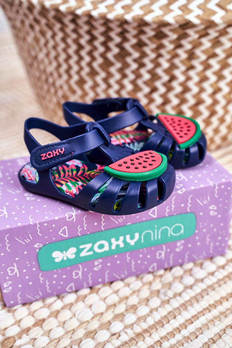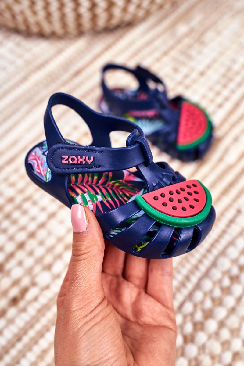 Nejnovější kolekce dětských sandálů ZAXY. Sandály vyrobené z měkkého a voňavého gumového materiálu, které v kombinaci s neuvěřitelně měkkou stélkou zajistí pohodlí našich dětí na každém kroku. Krásná dekorace v podobě sladkého melounu jim dává úžasné kouzlo. Snadné obouvání díky použití suchého zipu. Při výběru si zkontrolujte tabulku velikostí!