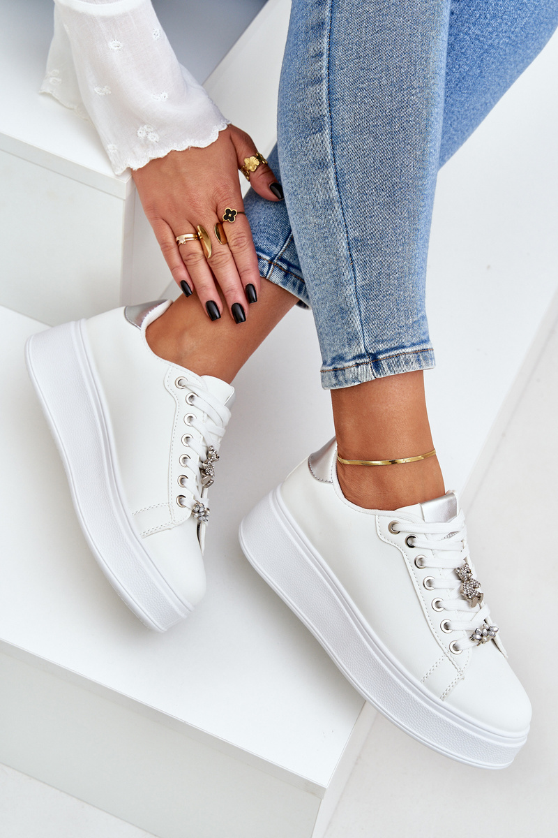 Dámské sneakersy z eko kůže. Upevněné na platformě, nejenže dodávají jemnou výšku, ale také zaručují pohodlí při nošení. Zaoblené špičky jim dodávají tradiční vzhled, a šněrování umožňuje dokonalé přizpůsobení noze. Roztomilé přívěsky na šněrování jsou výjimečný detail, který přináší originalitu a dívčí kouzlo. Tento model se skvěle hodí jak pro každodenní, tak pro volnější stylizace a představuje stylový doplněk do každého šatníku. Při výběru velikosti se řiďte tabulkou velikostí.