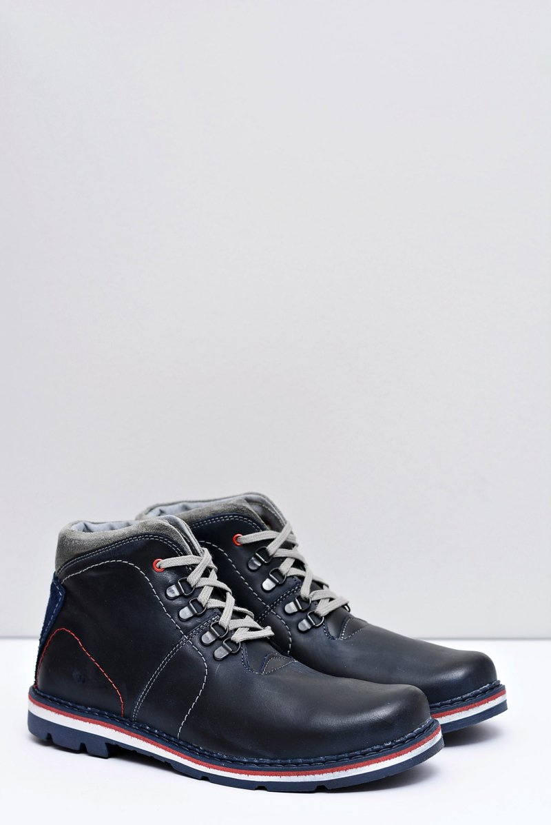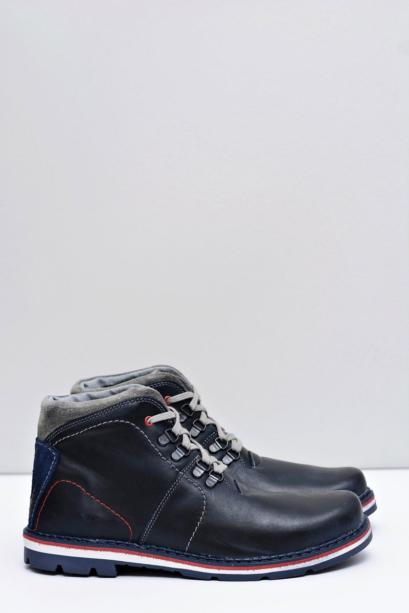 Granatowe Męskie Skórzane Ocieplane Botki Teslo