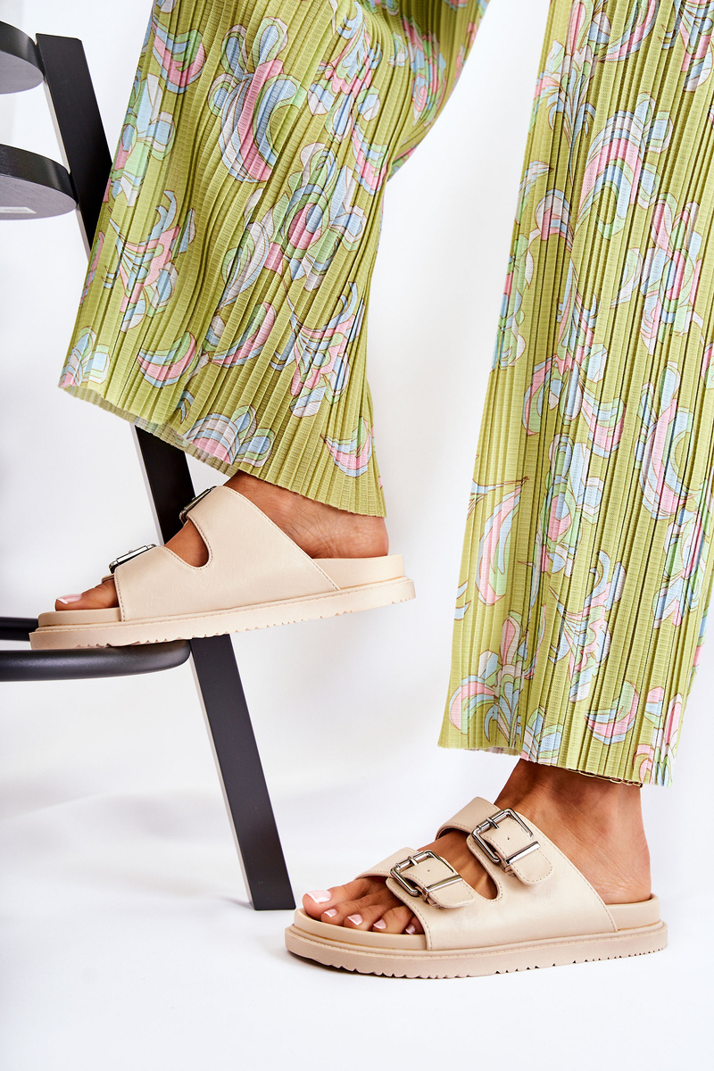 Klasické slip-ony z eko kůže. Jsou nasazeny na ploché, silnější podrážce. Vpředu mají dva nastavitelné popruhy s přezkou. Pohodlná, profilovaná stélka z pryžového materiálu. Ideální pro každodenní použití! Model s otevřenou, kulatou špičkou. Skvělá obuv na léto! Při výběru velikosti použijte tabulku velikostí.