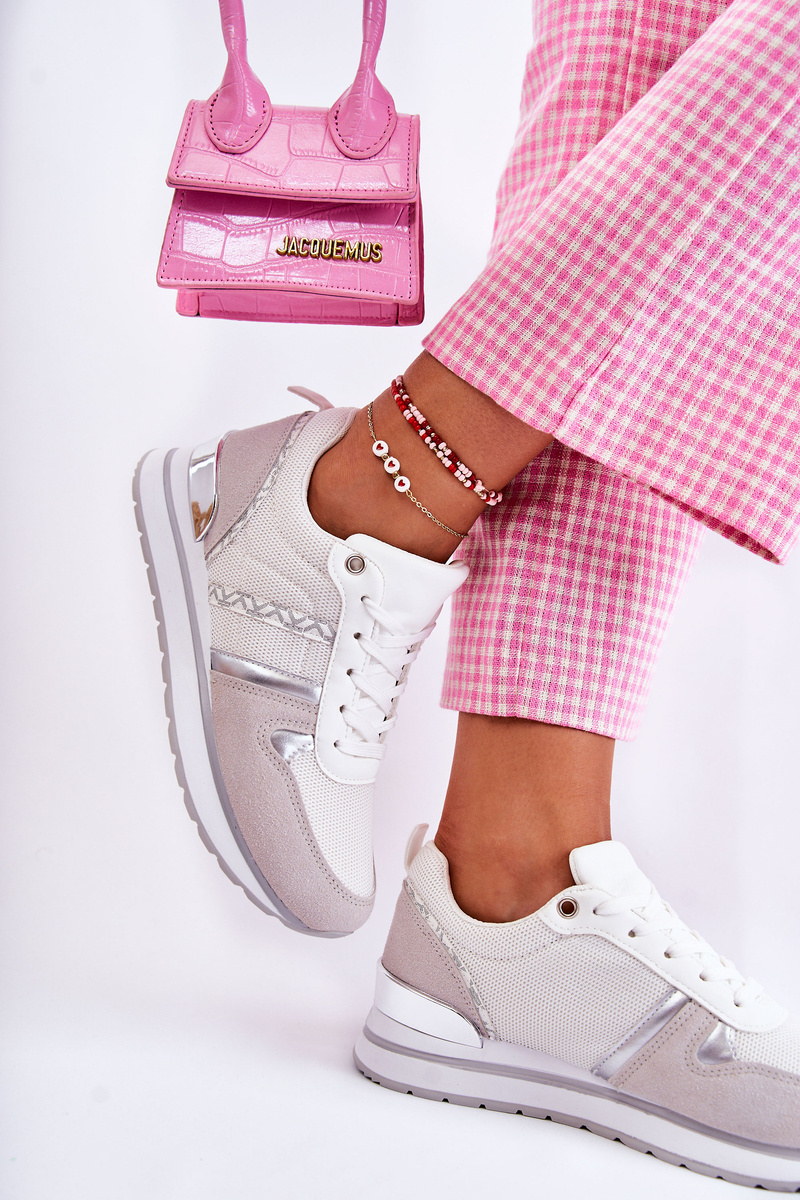 Sportovní boty nasazené na ploché podrážce s jemným klínem. Vzadu je podrážka zdobená zrcadlovým prvkem. Měkký svršek kotníku je vyroben z kombinace prodyšného materiálu, eko semiše a eko kůže. Uvnitř boty je pohodlná pěnová stélka potažená látkou. Model se zavazuje plochými tkaničkami, což umožňuje dokonalé přizpůsobení boty šířce nohy. Tento sportovní střih bude vypadat skvěle k džínám nebo joggerům. Při výběru velikosti použijte tabulku velikostí.