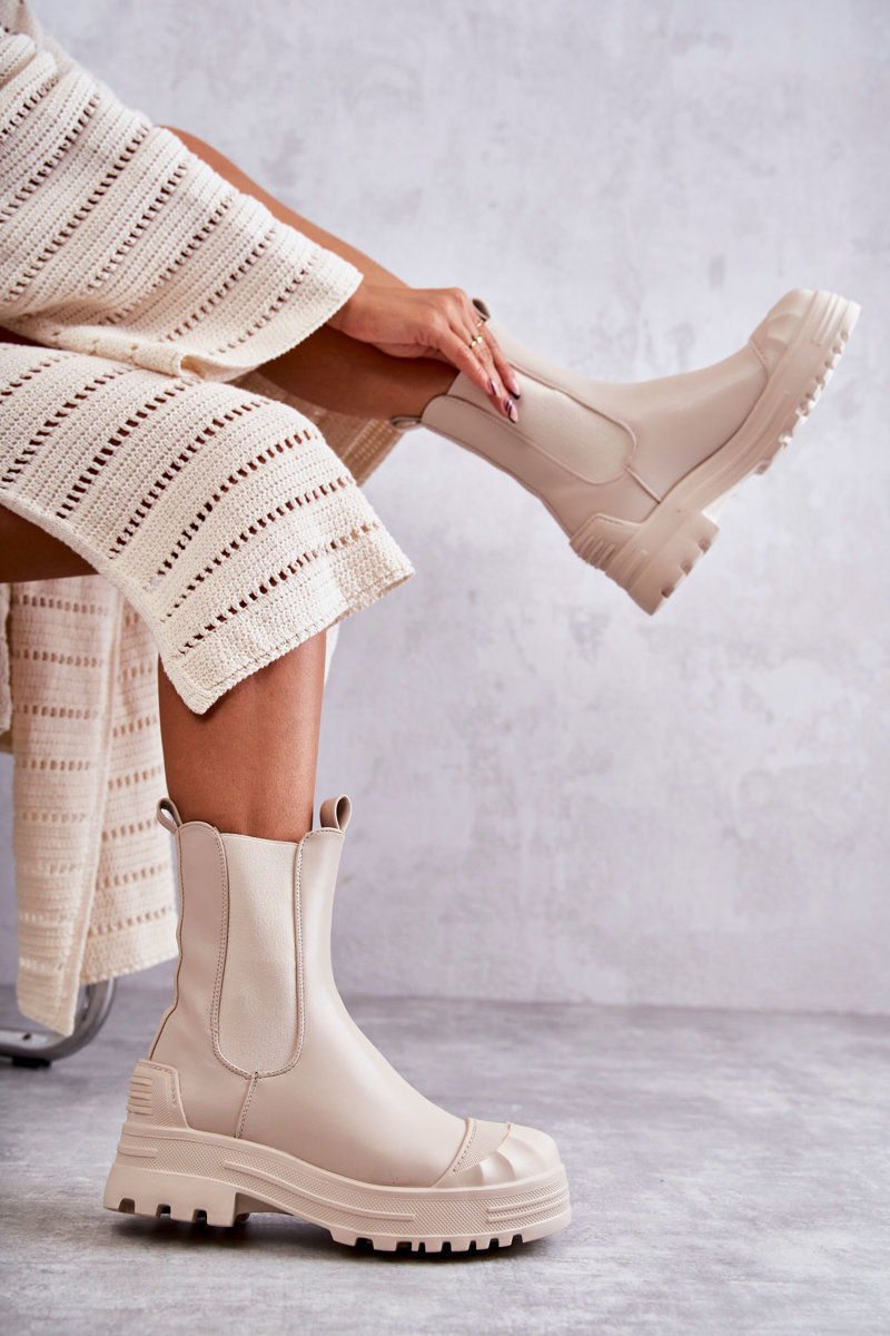 Neobvyklé a stylové dámské kozačky jsou vyrobeny z eko kůže. Nazouvací model. Podpatek je vyztužený. Na kulatém nosu je charakteristická plastová výztuha. Boty jsou namontovány na platformě a plochých podpatcích. Látková stélka. V horní části svršku jsou navíc poutka pro snadnější obouvání. Při výběru velikosti použijte tabulku velikostí.