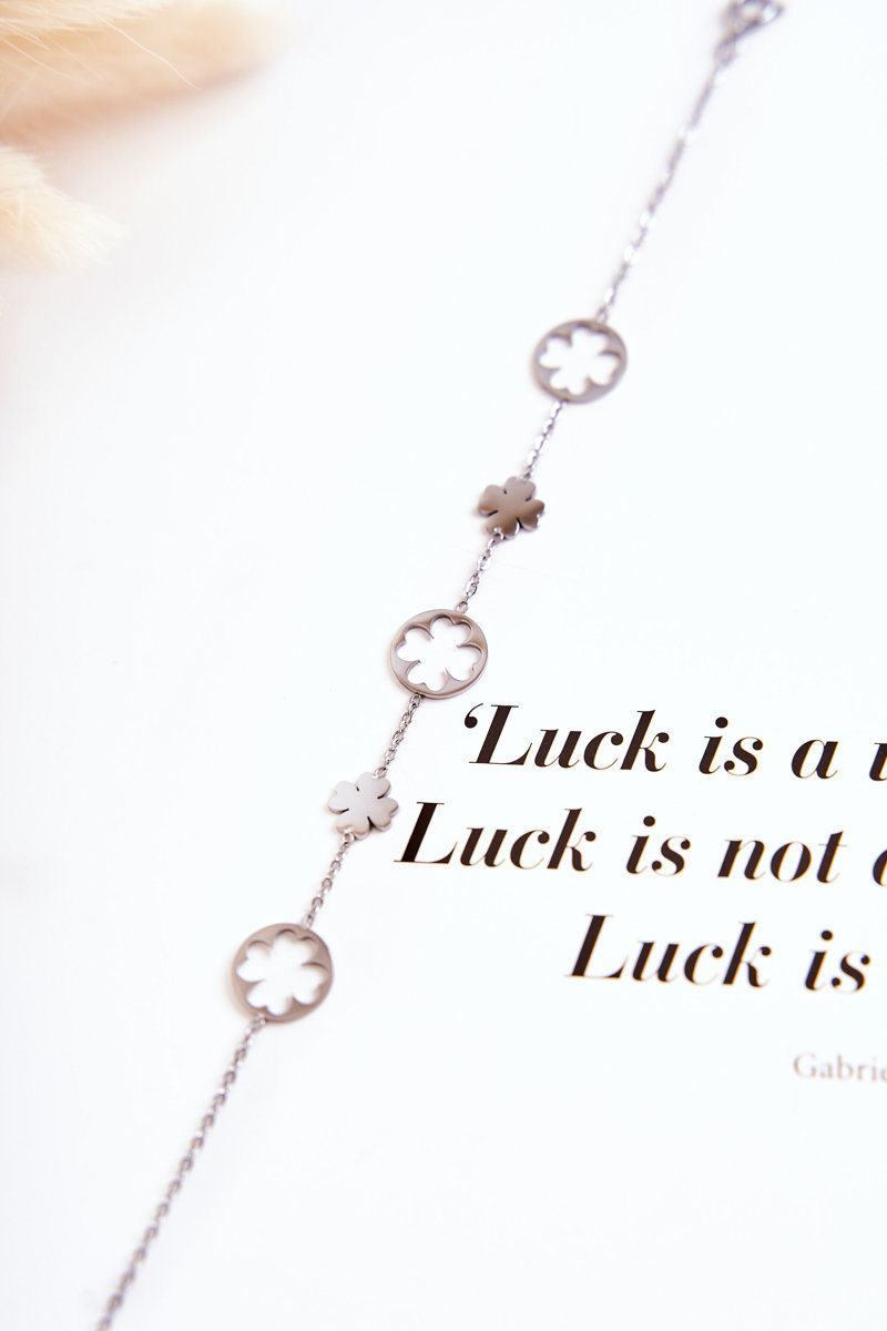 Klasický tenký dámský náramek vyrobený z nerezové oceli. Je délkově nastavitelná. Náramek s jemnou vazbou s ozdobami v podobě jetelů. Prezentuje se velmi elegantně. Můžete jej nosit jako doplněk k mnoha stylům, nejen elegantním, ale i každodenním. Určitě se také podívejte na zbytek naší nabídky dostupných modelů šperků. Skvělý model, jeden musíte mít!