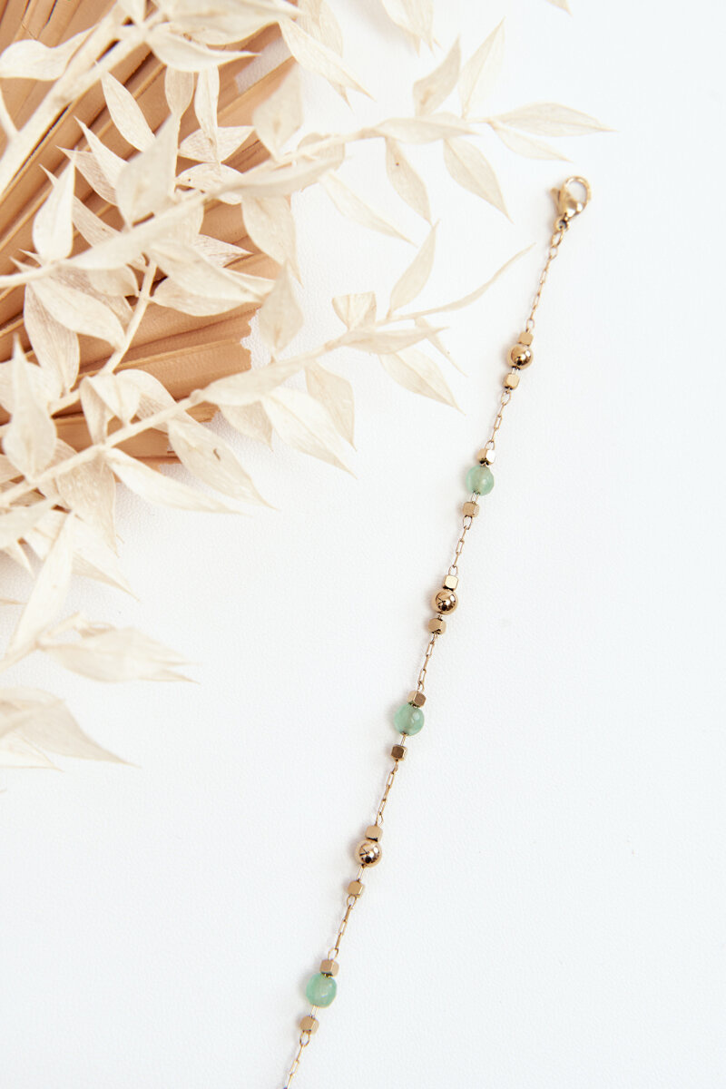 Klasický náramek na tenkém řetízku je vyroben z nerezové oceli. Je nastavitelná a zapíná se na karabinu. Celý náramek je zdobený korálky. Tento typ šperku je skvělým doplňkem ke stylingu nejen každodenního, ale i elegantnějšího.