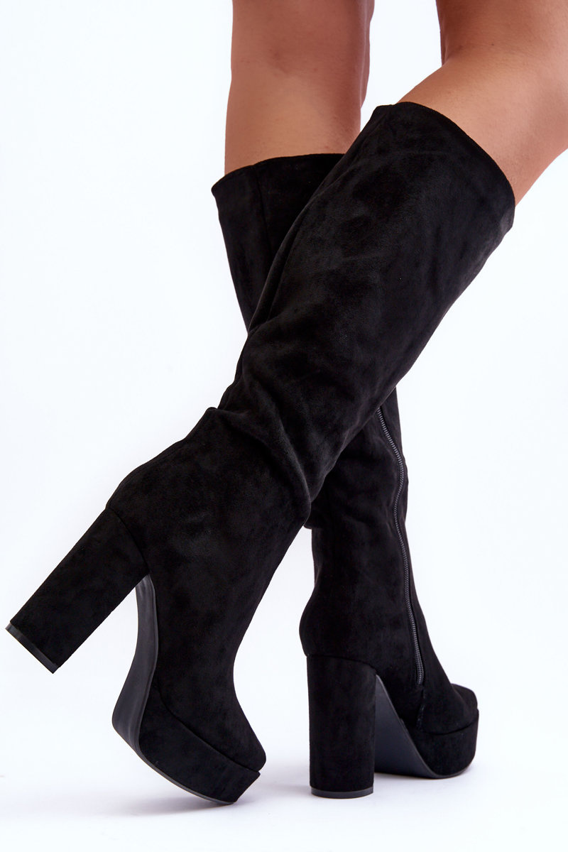 Tyto moderní dámské kozačky jsou vyrobeny z eko semiše. Osazeny na tlusté platformě a podpatku ve formě masivního sloupku. Model je uzavřen na zip. Horní část před koleno, čtvercové špičky. Skvělý styl, který vás vytáhne z davu. Neobsahují vyplnění. Musíte je mít! Při výběru velikosti se řiďte tabulkou velikostí.