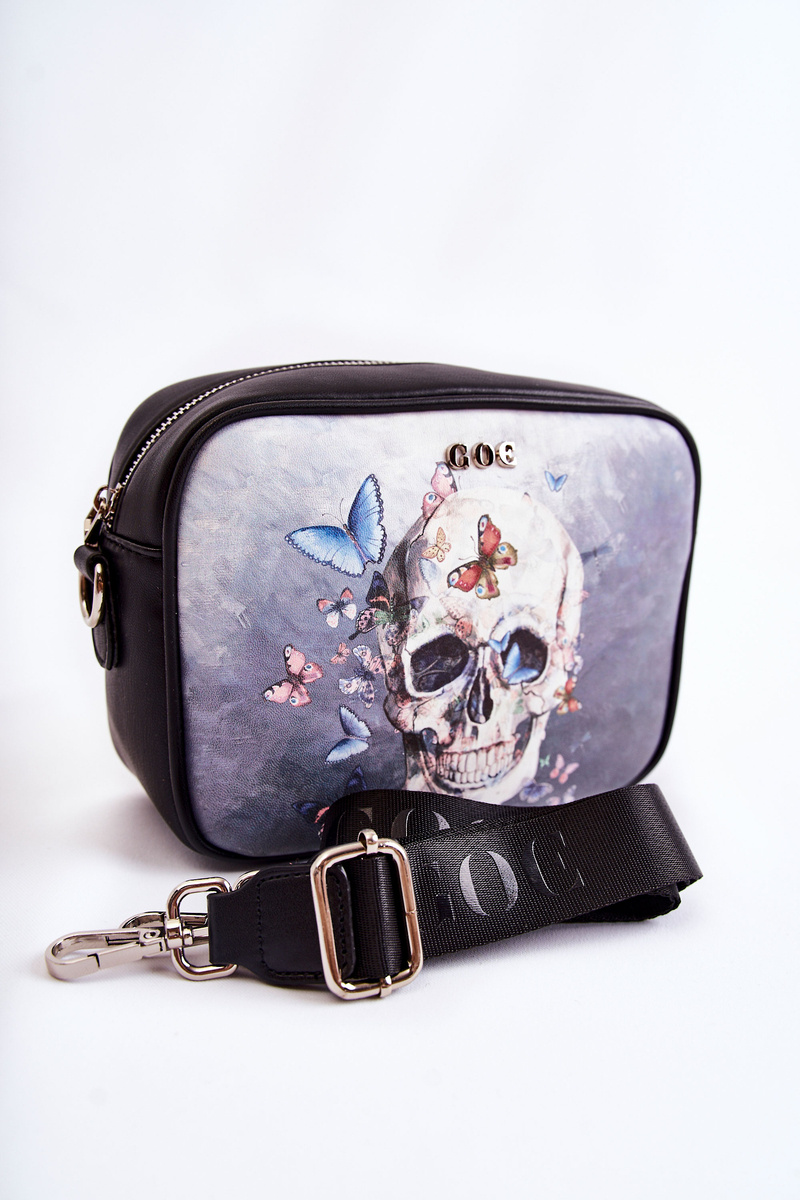 Jedinečná kabelka od renomované značky GOE! Vyrobeno z vysoce kvalitní eko kůže. Na přední straně je logo značky GOE a ozdobný motiv s lebkou a motýly. Taška má jednu komoru uzavíratelnou na zip. Uvnitř je jedna otevřená kapsa a jedna uzavíratelná na zip. Podšívka z látky s ozdobným vzorem. Na zadní straně tašky je navíc kapsa na zip. Taška má jeden nastavitelný, odnímatelný popruh.