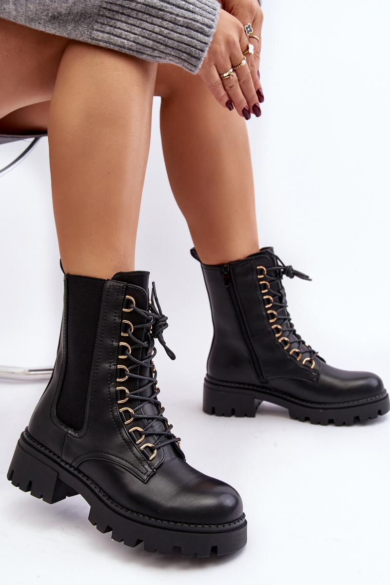 Dámské kozačky vyrobené z ekokože. Pevně usazené na plochém podpatku. Pružné vložky na nártu. Zaoblené špičky. Tento model se zapíná po straně na zip a má také tkaničky. Vnitřek je vyložený kožešinou. Skvělý model pro podzimní a zimní styly! Při výběru velikosti se řiďte tabulkou velikostí.