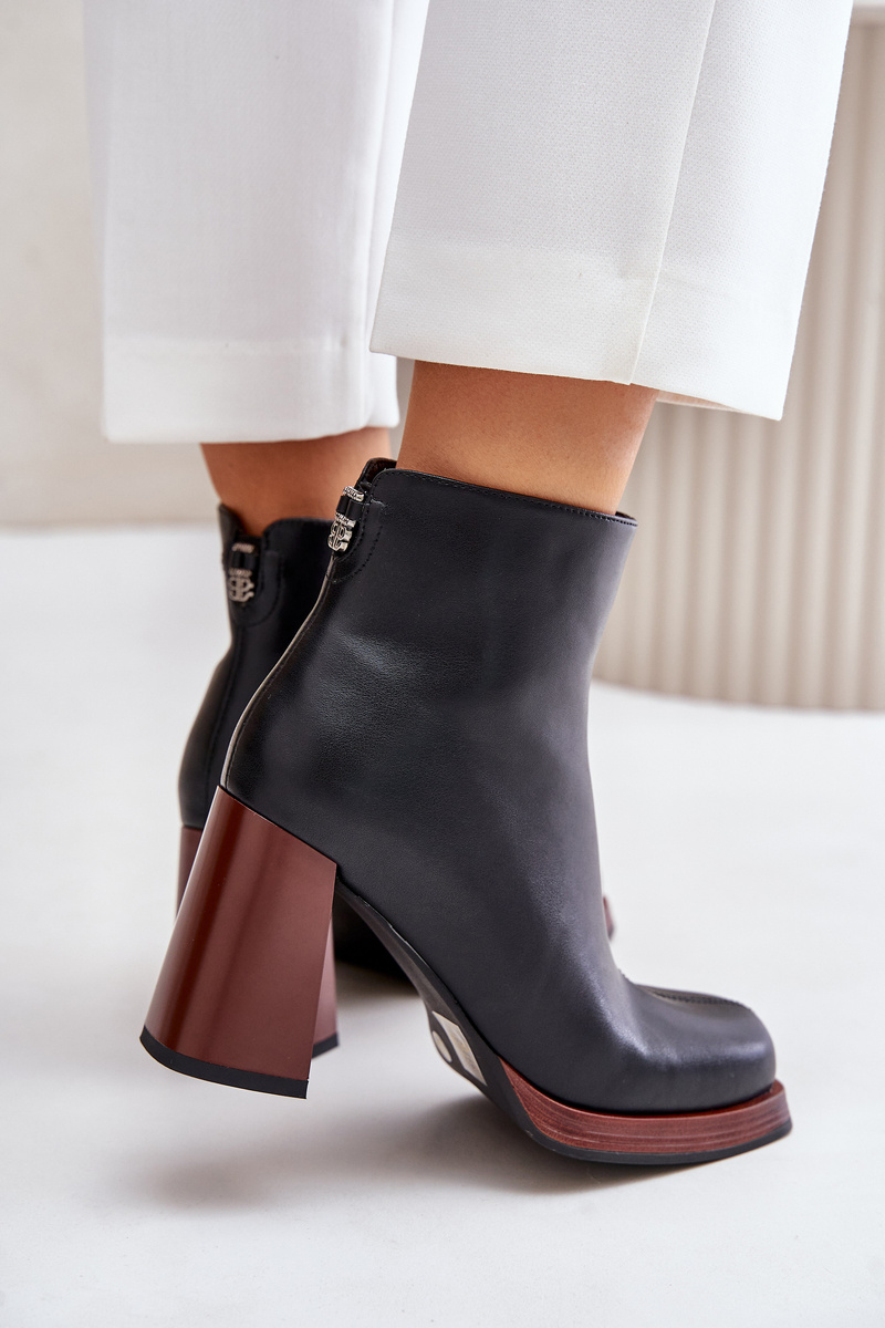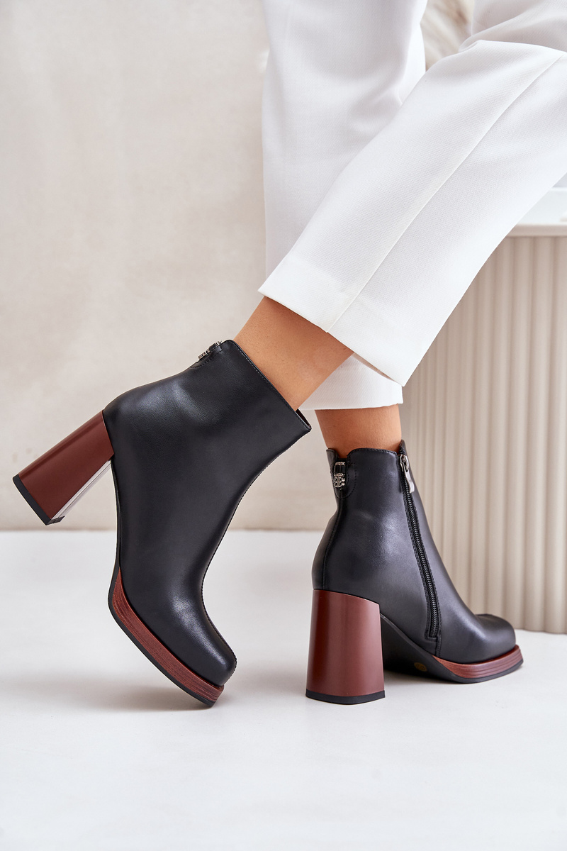 Dámské boty vyrobené z přírodní kůže. Usazeny na sloupkovém podpatku. Špičky zaoblené. Svršek nad kotníkem. Zapínání na zip. Vzadu malý ozdobný detail. Vnitřek obuvi je zateplen měkkou obuvnickou dekou. Tento elegantní střih dokonale doplní mnoho podzimních a zimních stylizací! Při výběru velikosti se řiďte tabulkou velikostí.