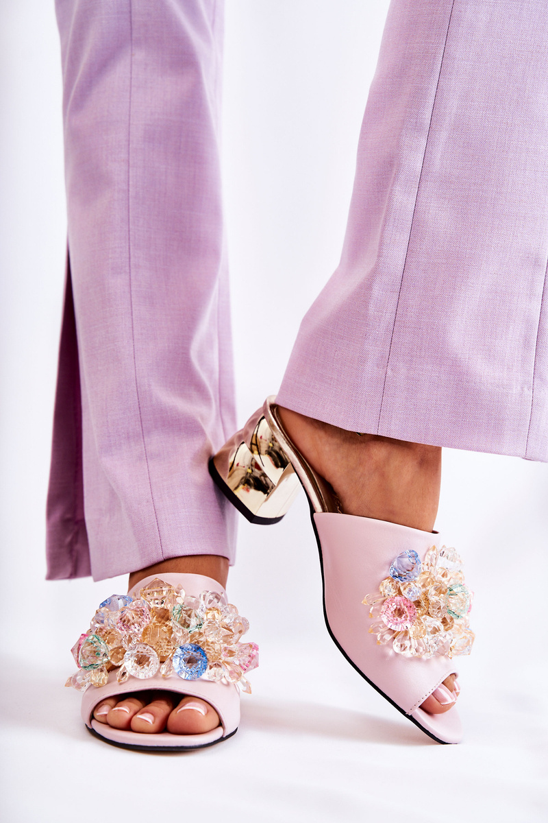 Kožené dámské pantofle na vysokých podpatcích s zdobením růžove Calinda