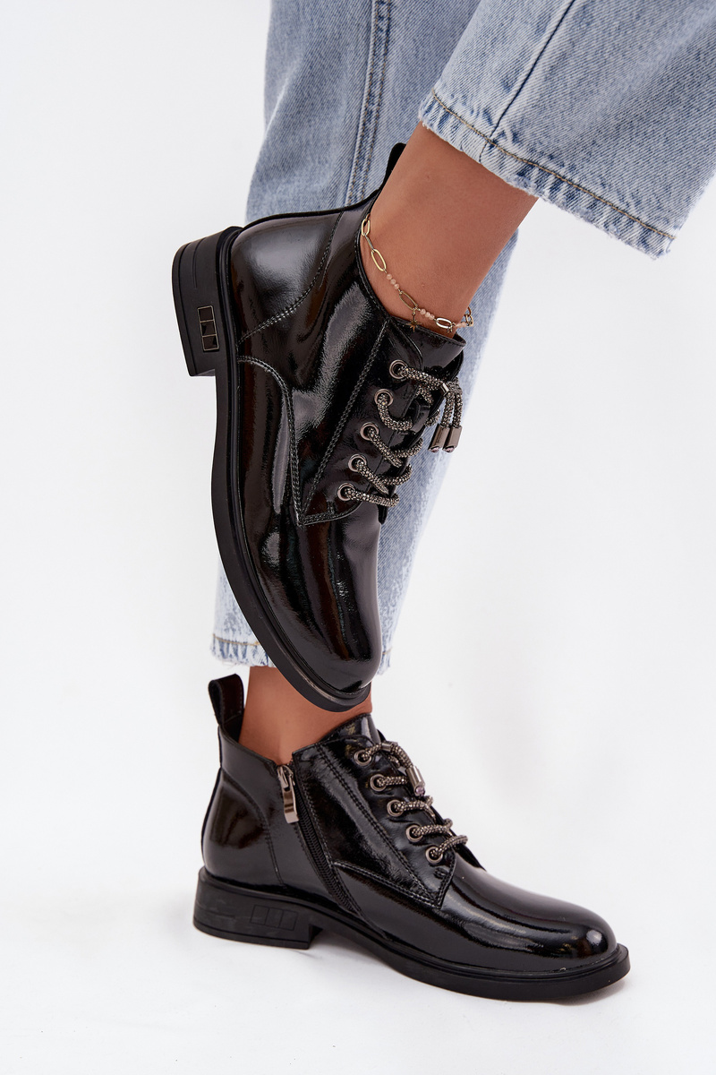 Kožené lakované dámské kotníčkové boty s ozdobným šněrováním D&A MR52-124 Černé
