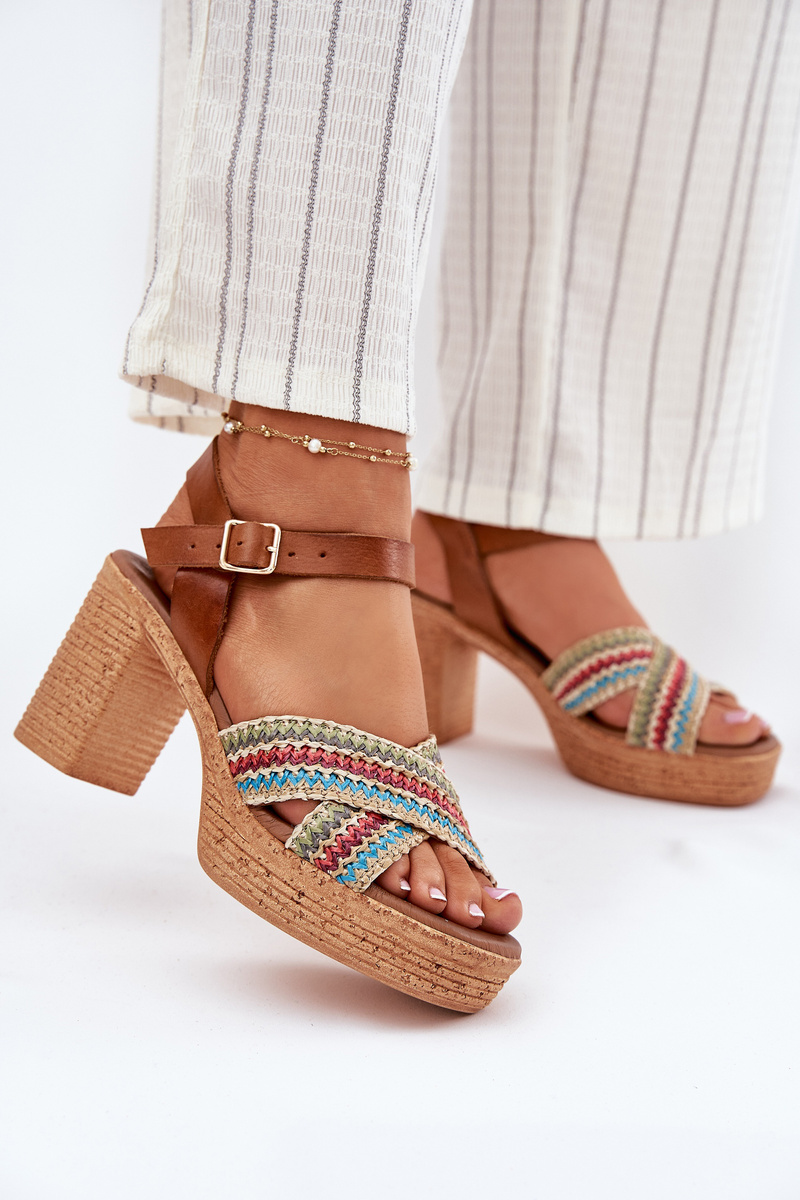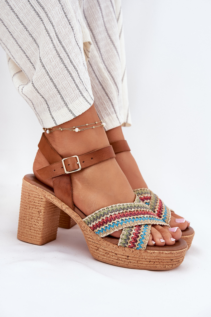 Kožené Sandály Na Podpatku S Pletením Na Páscích Hnědé Zazoo 40460