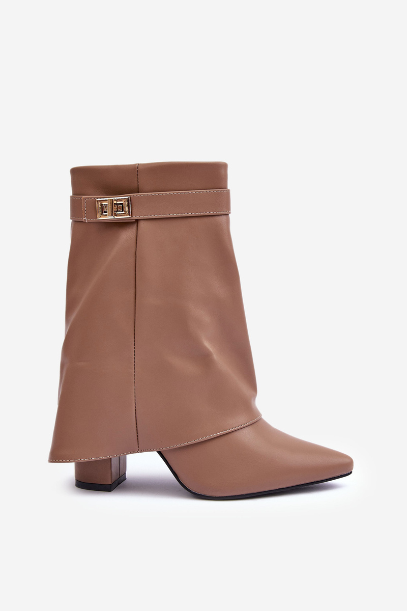 Stylové kozačky s volnou cholebou až do poloviny lýtka. Osazené na podpatku ve tvaru sloupu. Vnitřek je zateplen kožešinou. Tento model má cholebu překrývající koturnu, což odlišuje toto obuv od ostatních kozaček. Špička je zpevněná. Při výběru velikosti se řiďte tabulkou velikostí.