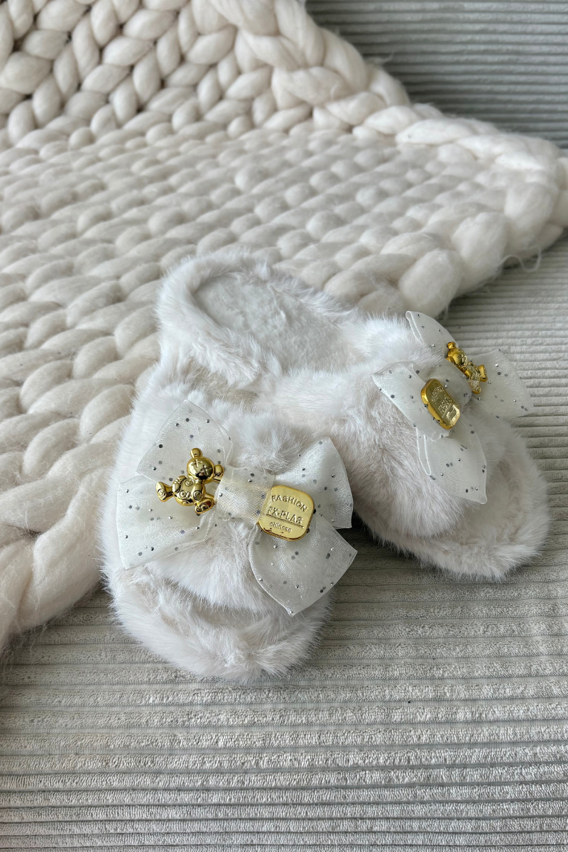 Kožešinové dámské pantofle s mašlí a zlatým ozdobou světle béžové Nolara