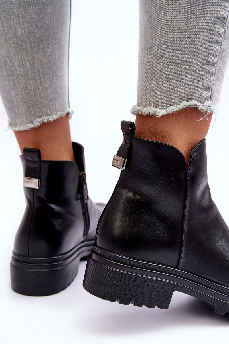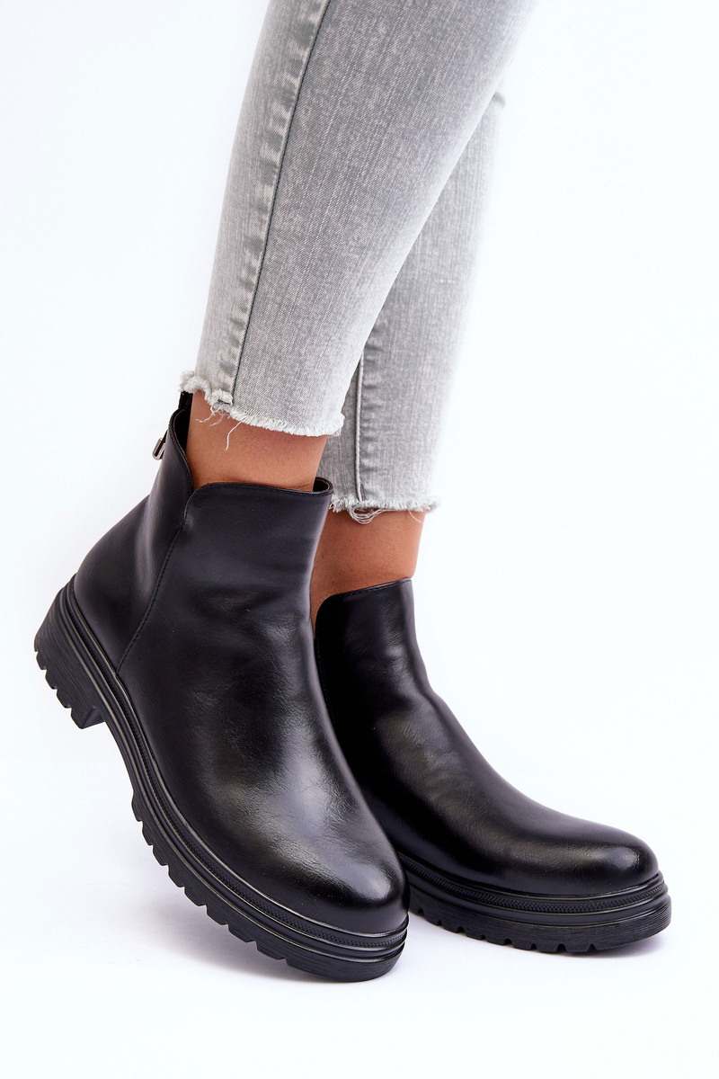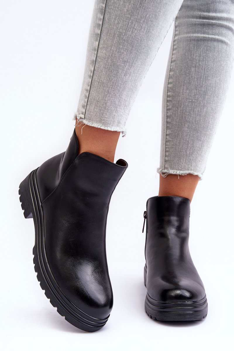 Klasické dámské botky s nízkou podešví. Osazené na platformě a plochém, stabilním podpatku. Model s zaobleným špičkou. Vyrobeno z eko kůže. Vnitřek vyplněn kožešinou. Navíc je patka zesílená. Botky jsou zapínány na zip na vnitřní straně podešve. Při výběru velikosti se řiďte tabulkou velikostí.