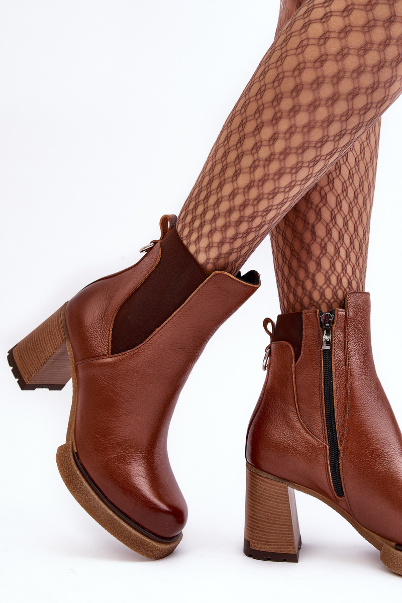 Boty na platformě a podpatku ve tvaru sloupku. Horní část za kotník. Vyrobeno z přírodní kůže. Na horní části elastický vložka. Upevnění zipem na vnitřní straně. Boty jsou izolovány obuvníkem. Podrážka je protiskluzová. Boty se skvěle hodí do podzimních stylizací. Při výběru velikosti se řiďte tabulkou velikostí.