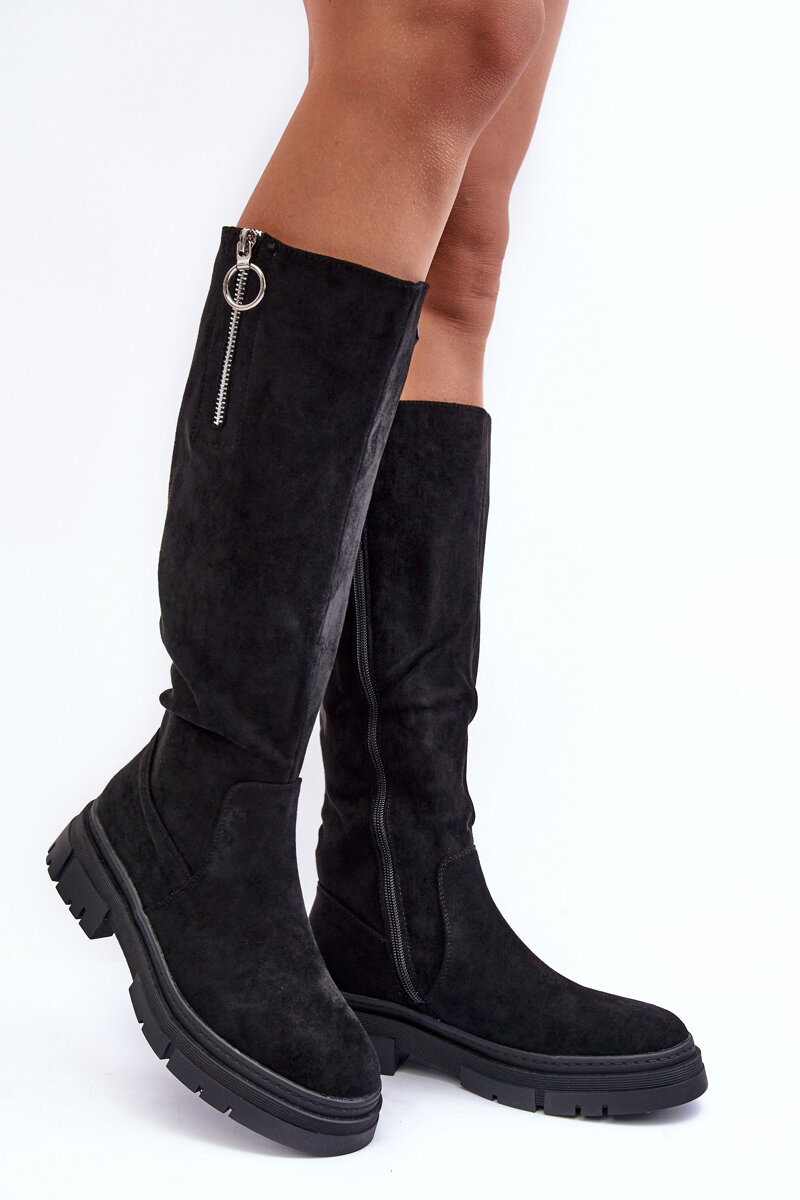 Dámské kozačky vyrobené z ekologického semiše. Osazené na plochém podpatku a platformě. Špičky jsou zaoblené. Zapíná se na zip po straně. Na horní straně jsou vyšívané průseky a krátký zip. Střed je zateplený kožešinou. Při výběru velikosti se řiďte tabulkou velikostí.