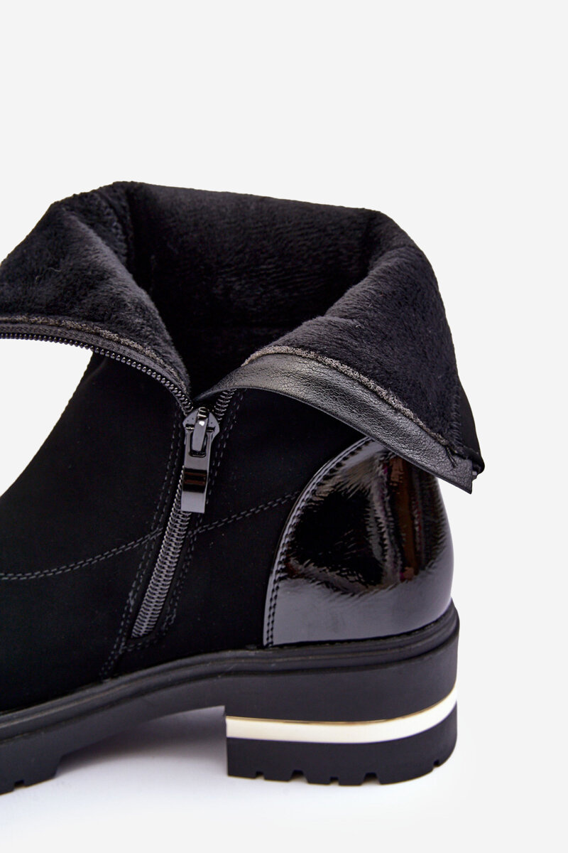 Boty ženy se nacházejí na plochém podpatku a platformě. Vyrobeno z eko kůže. Špičky zaoblené. Střed zateplený obuvním kožíškem. Na podpatku zrcadlová ozdoba. Model uzavřený na zip po straně horní části. Klasický model pro mnoho podzimních stylů! Při výběru velikosti se řiďte tabulkou velikostí.