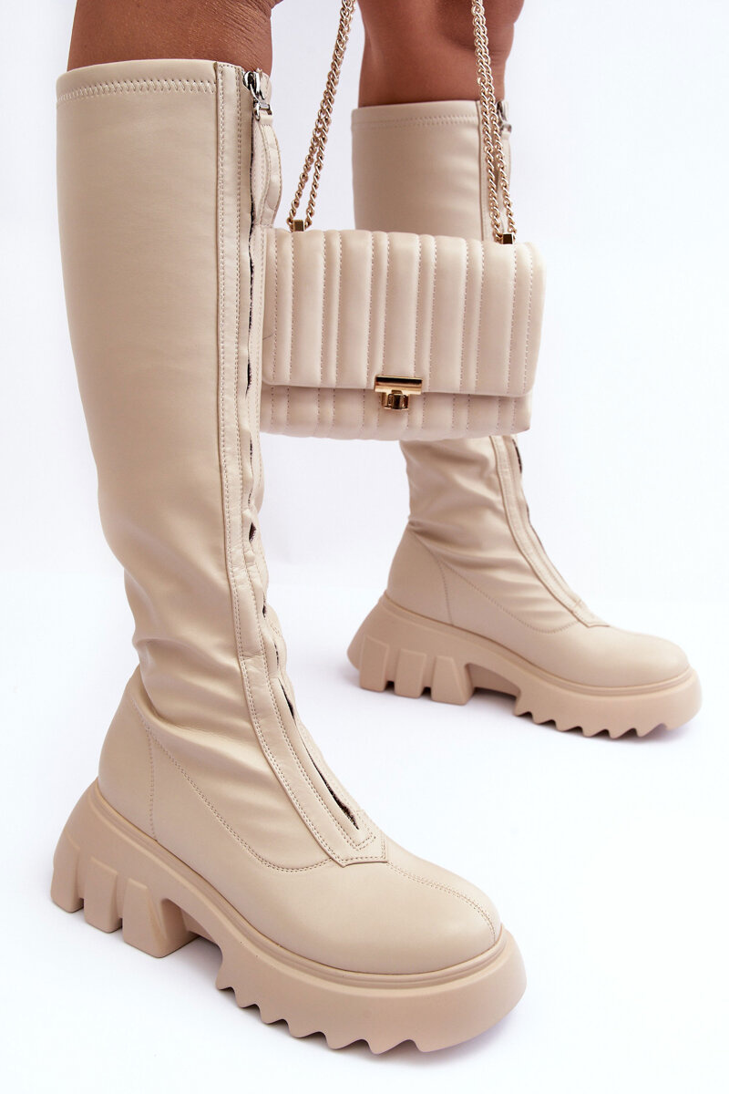 Kůže Kozaky Na Masivní Platformě Se Zipem Bežové Ringo
